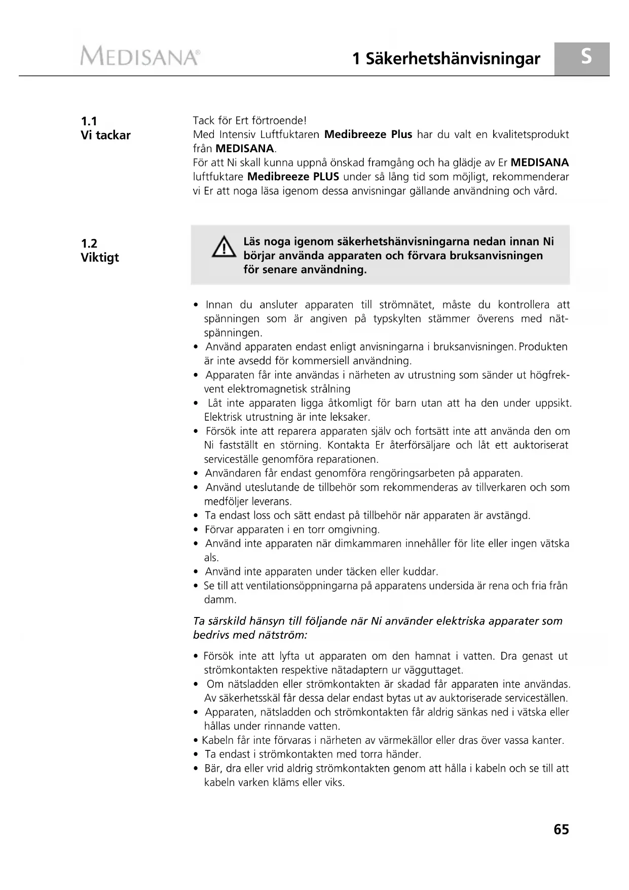 Viktigt Tack för Ert förtroende! Med Intensiv Luftfuktaren Medibreeze Plus har du valt en kvalitetsprodukt från MEDISANA. För att Ni skall kunna uppnå önskad framgång och ha glädje av Er MEDISANA luftfuktare Medibreeze PLUS under så lång tid som möjligt, rekommenderar vi Er att noga läsa igenom dessa anvisningar gällande användning och vård. Läs noga igenom säkerhetshänvisningarna nedan innan Ni börjar använda apparaten och förvara bruksanvisningen för senare användning.