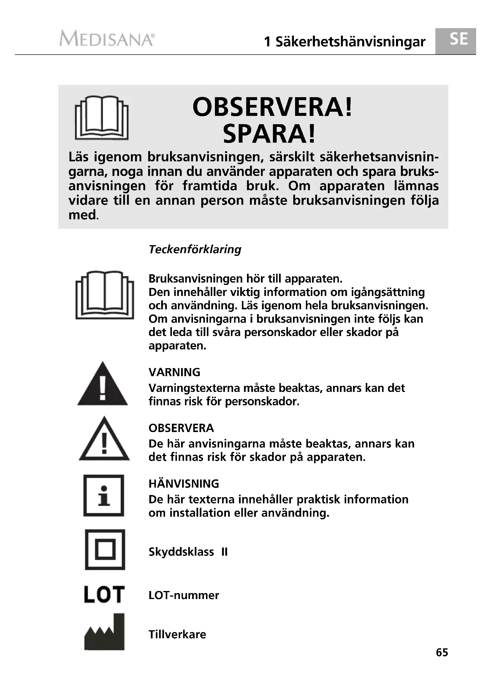 OBSERVERA! SPARA! Bruksanvisningen hör till apparaten. Den innehåller viktig information om igångsättning och användning. Läs igenom hela bruksanvisningen. Om anvisningarna i bruksanvisningen inte följs kan det leda till svåra personskador eller skador på apparaten. VARNING Varningstexterna måste beaktas, annars kan det finnas risk för personskador. OBSERVERA De här anvisningarna måste beaktas, annars kan det finnas risk för skador på apparaten. HÄNVISNING De här texterna innehåller praktisk information om installation eller användning. Skyddsklass II LOT-nummer Tillverkare Läs igenom bruksanvisningen, särskilt säkerhetsanvisnin- garna, noga innan du använder apparaten och spara bruks- anvisningen för framtida bruk. Om apparaten lämnas vidare till en annan person måste bruksanvisningen följa med