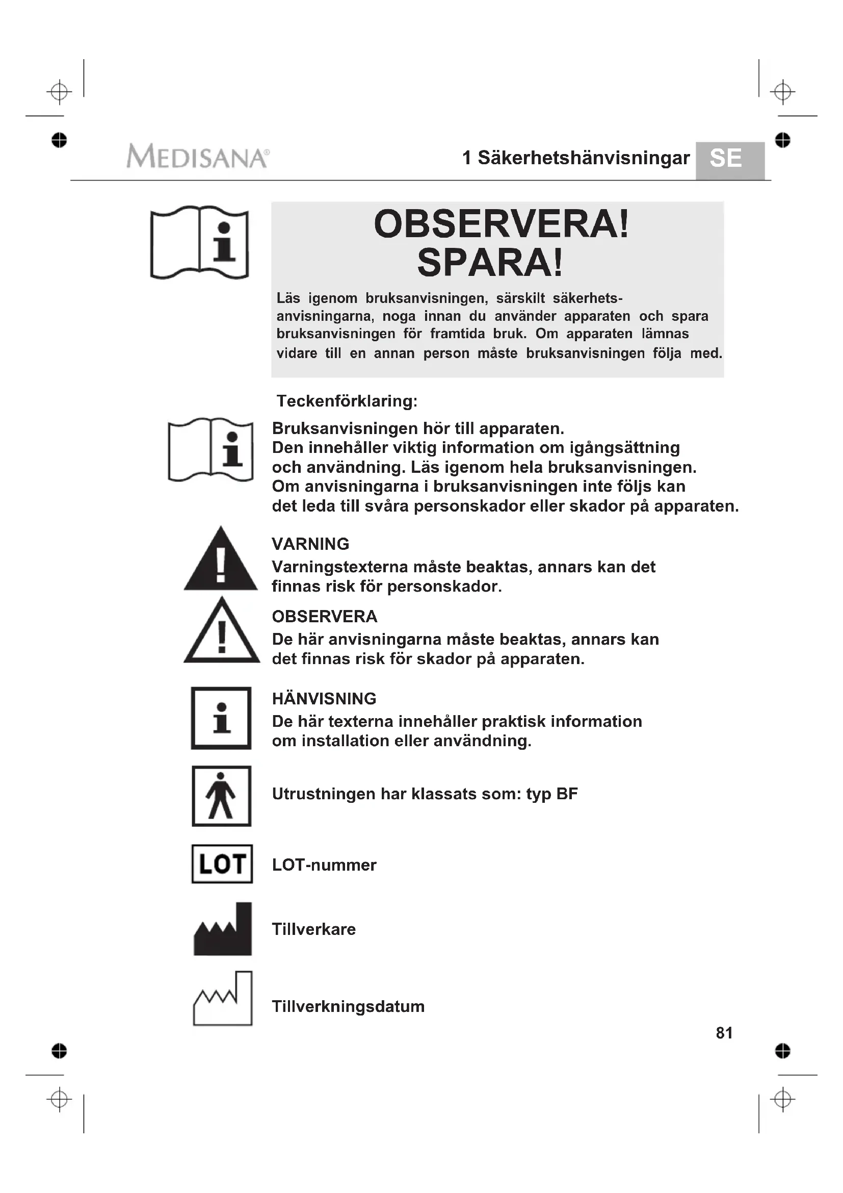 Teckenförklaring: LOT-nummer Tillverkningsdatum Utrustningen har klassats som: typ BF OBSERVERA! SPARA! Bruksanvisningen hör till apparaten. Den innehåller viktig information om igångsättning och användning. Läs igenom hela bruksanvisningen. Om anvisningarna i bruksanvisningen inte följs kan det leda till svåra personskador eller skador på apparaten. VARNING Varningstexterna måste beaktas, annars kan det finnas risk för personskador. OBSERVERA De här anvisningarna måste beaktas, annars kan det finnas risk för skador på apparaten. HÄNVISNING De här texterna innehåller praktisk information om installation eller användning. Tillverkare Läs igenom bruksanvisningen, särskilt säkerhets- anvisningarna, noga innan du använder apparaten och spara bruksanvisningen för framtida bruk. Om apparaten lämnas vidare till en annan person måste bruksanvisningen följa med.1 Säkerhetshänvisningar