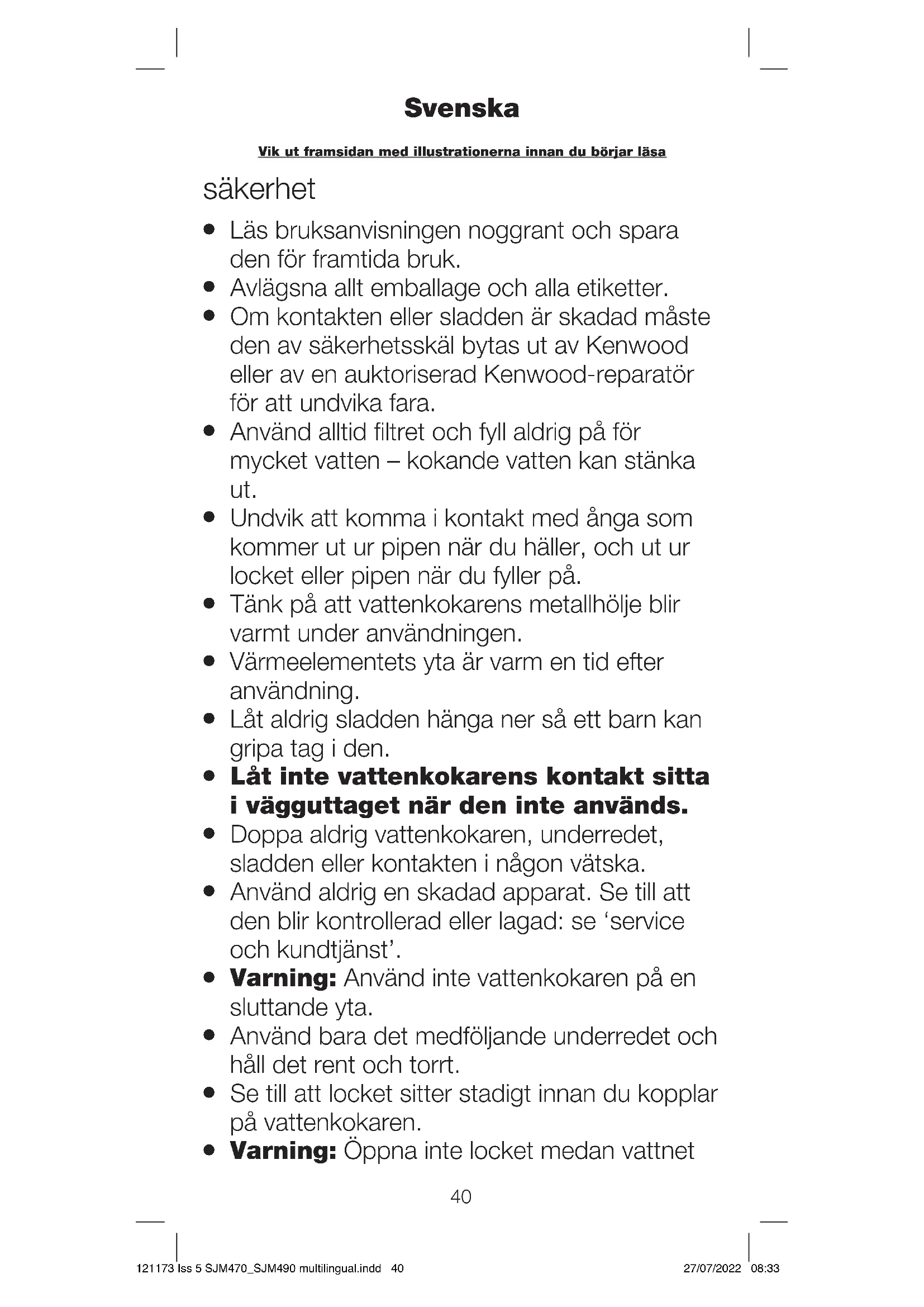 Den här apparaten uppfyller EG förordning 1935/2004 om material och produkter avsedda att komma i kontakt med livsmedel. 121173 Iss 5 SJM470_SJM490 multilingual.indd 41121173 Iss 5 SJM470_SJM490 multilingual.indd 41 27/07/2022 08:3327/07/2022 08:3342 innan du använder vattenkokaren första gången 1 Vira upp extra sladdlängd runt hållaren på undersidan av bottenplattan g. 2 Fyll på vatten till "MAX"-nivån, koka upp och slå sedan bort vattnet. Upprepa tre gånger. förklaring till bilder a pip b fällbart lock c lockfrigöring d vattennivåfönster e på/av-knapp med indikatorlampa f 360° kraftdel g sladdvinda h filter använda vattenkokaren
