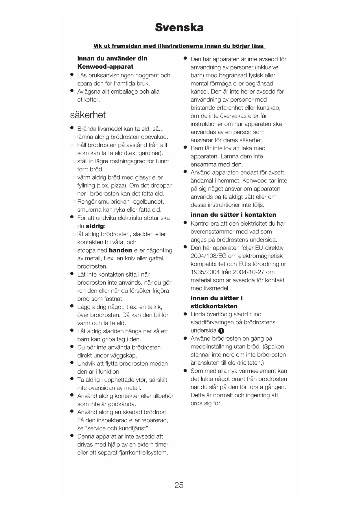 håll brödrosten på avstånd från allt som kan fatta eld (t.ex. gardiner). ställ in lägre rostningsgrad för tunnt torrt bröd. värm aldrig bröd med glasyr eller fyllning (t.ex. pizza). Om det droppar ner i brödrosten kan det fatta eld. Rengör smulbrickan regelbundet, smulorna kan ryka eller fatta eld.