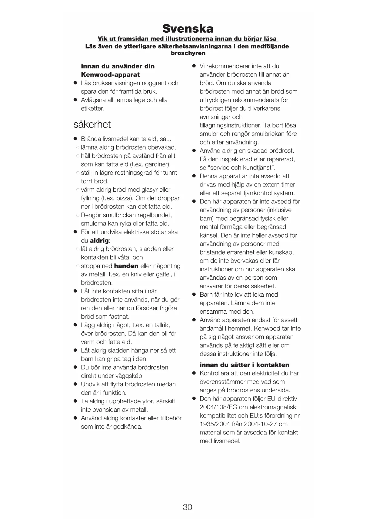 Använd apparaten endast för avsett ändamål i hemmet. Kenwood tar inte på sig något ansvar om apparaten används på felaktigt sätt eller om dessa instruktioner inte följs. innan du sätter i kontakten