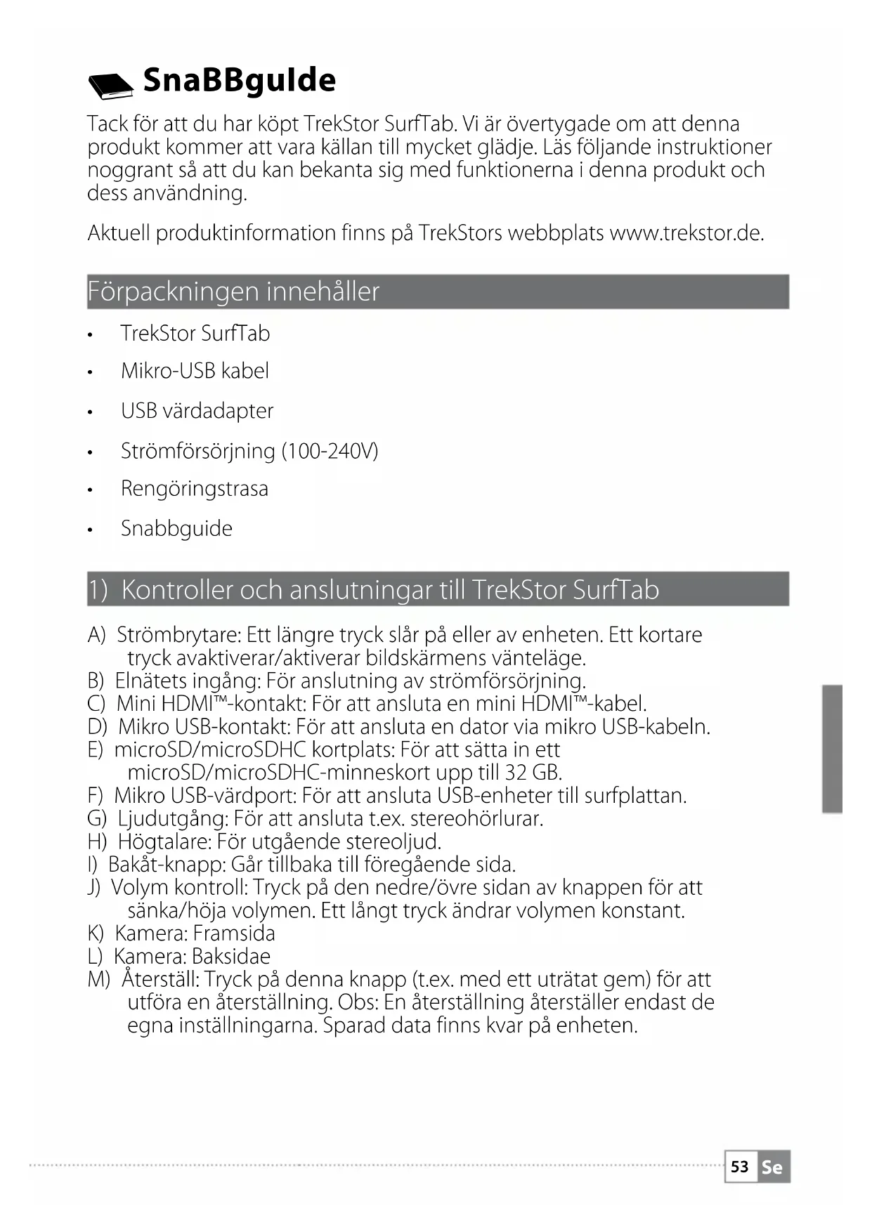 SnaBBguIde Tack för att du har köpt TrekStor SurfTab. Vi är övertygade om att denna produkt kommer att vara källan till mycket glädje. Läs följande instruktioner noggrant så att du kan bekanta sig med funktionerna i denna produkt och dess användning. Aktuell produktinformation finns på TrekStors webbplats www.trekstor.de. Förpackningen innehåller