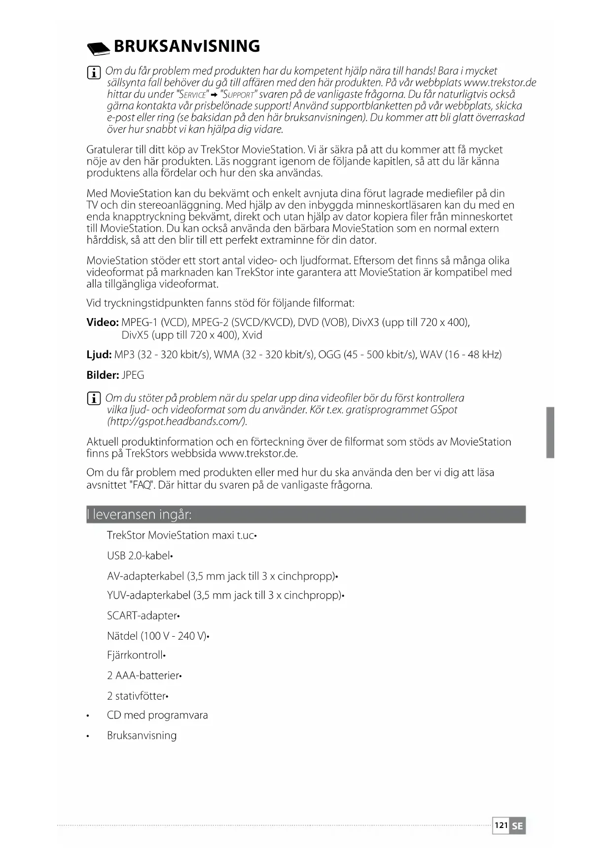 Om du stöter på problem när du spelar upp dina videofiler bör du först kontrollera vilka ljud- och videoformat som du använder. Kör t.ex. gratisprogrammet GSpot (http://gspot.headbands.com/). Aktuell produktinformation och en förteckning över de filformat som stöds av MovieStation finns på TrekStors webbsida www.trekstor.de. Om du får problem med produkten eller med hur du ska använda den ber vi dig att läsa avsnittet "FAQ". Där hittar du svaren på de vanligaste frågorna. I leveransen ingår: TrekStor MovieStation maxi t.uc• USB 2.0-kabel• AV-adapterkabel (3,5 mm jack till 3 x cinchpropp)• YUV-adapterkabel (3,5 mm jack till 3 x cinchpropp)• SCART-adapter• Nätdel (100 V - 240 V)• Fjärrkontroll• 2 AAA-batterier• 2 stativfötter• CD med programvara• Bruksanvisning •SE