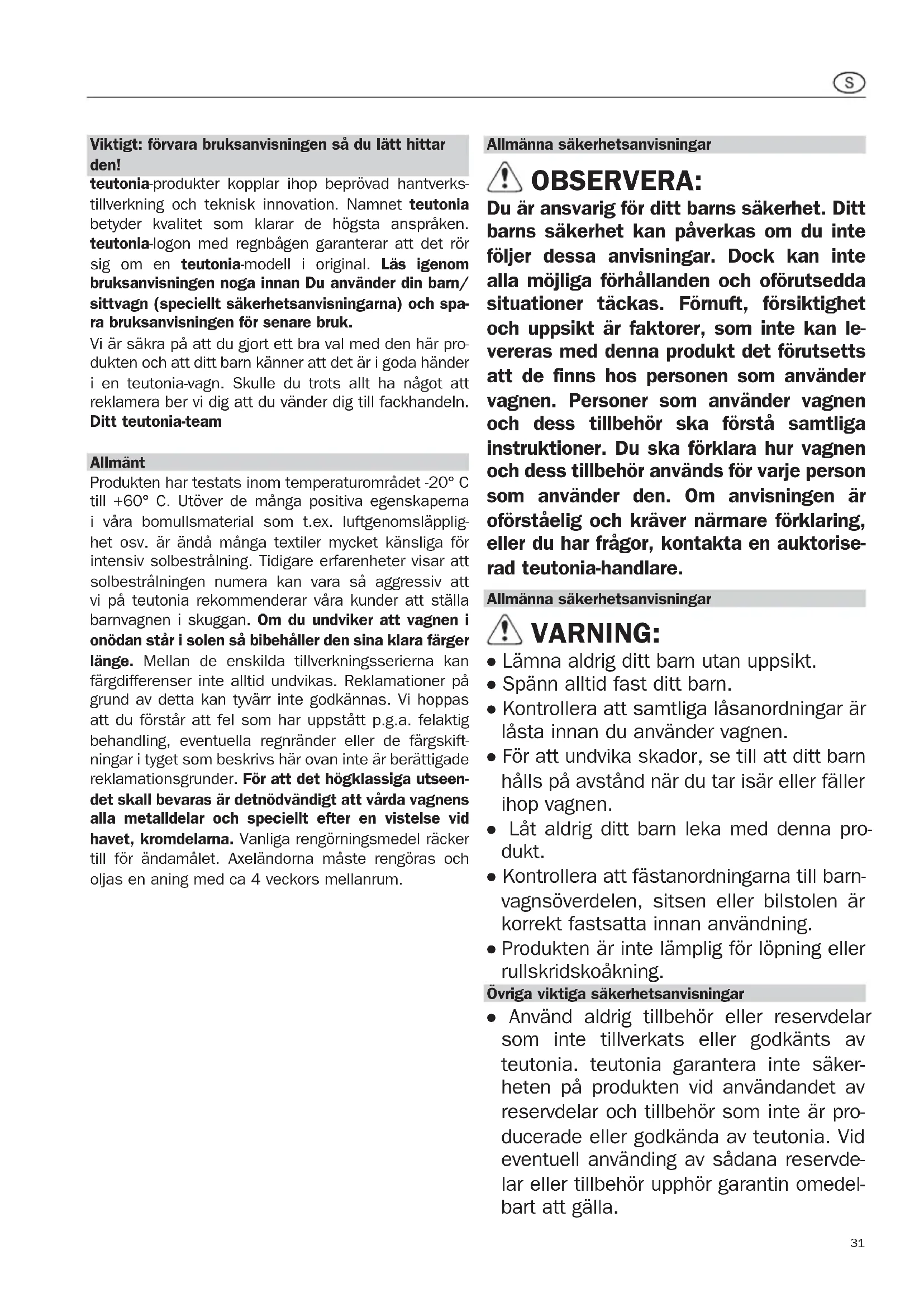 Produkten har testats inom temperaturområdet -20° C till +60° C. Utöver de manga positiva egenskaperna i vara bomullsmaterial som t.ex. luftgenomsläpplighet osv. ar anda manga textiler mycket känsliga for intensiv solbestrånlning. Tidigare erfarenheter visar att solbesträlningen numera kan vara sa aggressiv att vi på teutonia rekommenderar vara kunder att stalla barnvagnen i skuggan. Om du undviker att vagnen i onodan staredi solen sa bibeḥaller den sina klara färger langle. Mellan de enskilda tillverkningsserierna kan fārdifferenser inte alltid undvikas. Reklamationer på grund av detta kan tyvarr inte godkännas. Vi hoppas att du Förstår att fel som har uppstatt p.g.a. felaktig behandling, eventuella regnändere eller de fārgskiftninger i tyget som beskrivs HAR ovan inte ar berättigade reklamationsgrunder. För att det högklassiga utseen-det skall bevaras ar detnödvändigt att vårda vagnens alla metalldelar och speciellt after en vistelse vid havet, kromdelarna. Vanliga rengörningsmedel räckert till for andamålet. Axeländorna maste rengöras och oljas en aning med ca 4 vechors mellanrum.