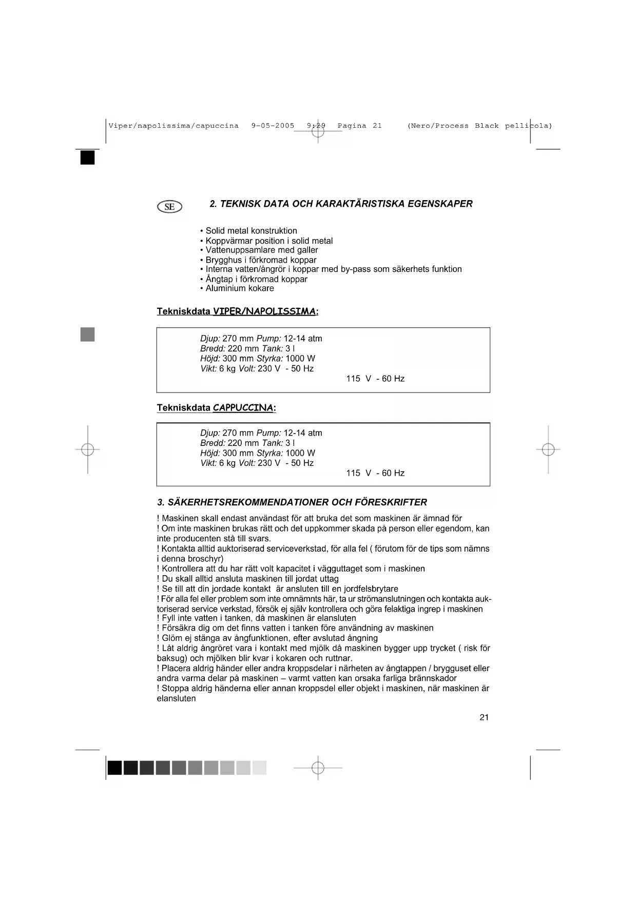 ! Maskinen skall endast användast för att bruka det som maskinen är ämnad för ! Om inte maskinen brukas rätt och det uppkommer skada på person eller egendom, kan inte producenten stå till svars. ! Kontakta alltid auktoriserad serviceverkstad, för alla fel ( förutom för de tips som nämns i denna broschyr) ! Kontrollera att du har rätt volt kapacitet i vägguttaget som i maskinen ! Du skall alltid ansluta maskinen till jordat uttag ! Se till att din jordade kontakt är ansluten till en jordfelsbrytare ! För alla fel eller problem som inte omnämnts här, ta ur strömanslutningen och kontakta auk- toriserad service verkstad, försök ej själv kontrollera och göra felaktiga ingrep i maskinen ! Fyll inte vatten i tanken, då maskinen är elansluten ! Försäkra dig om det finns vatten i tanken före användning av maskinen ! Glöm ej stänga av ångfunktionen, efter avslutad ångning ! Låt aldrig ångröret vara i kontakt med mjölk då maskinen bygger upp trycket ( risk för baksug) och mjölken blir kvar i kokaren och ruttnar. ! Placera aldrig händer eller andra kroppsdelar i närheten av ångtappen / brygguset eller andra varma delar på maskinen – varmt vatten kan orsaka farliga brännskador ! Stoppa aldrig händerna eller annan kroppsdel eller objekt i maskinen, när maskinen är elansluten Viper/napolissima/capuccina 9-05-2005 9:29 Pagina 21 (Nero/Process Black pellicola)22 ! Ta aldrig i maskinen med våta händer eller fötter ! Ta aldrig på maskinens heta delar, så som brygghuset eller ångtappen ! Före varje rutinkontroll, kontrollera att maskinen ej är elansluten, slit aldrig i elkontakterna ! Om huvudelkabeln skulle bli skadad lämna till serviceverkstad för byte ! Sänk aldrig ner maskinen i någon form av vätska ! Använd aldrig frätande eller farliga vätskor för att göra rent maskinen ! Utsätt inte maskinen för atmosfäriska störningar ! Lämna ej maskinen obevakad med barn eller personer som inte vet hur man sköter maskinen ! Placera ej maskinen i närheten av varma elementkällor