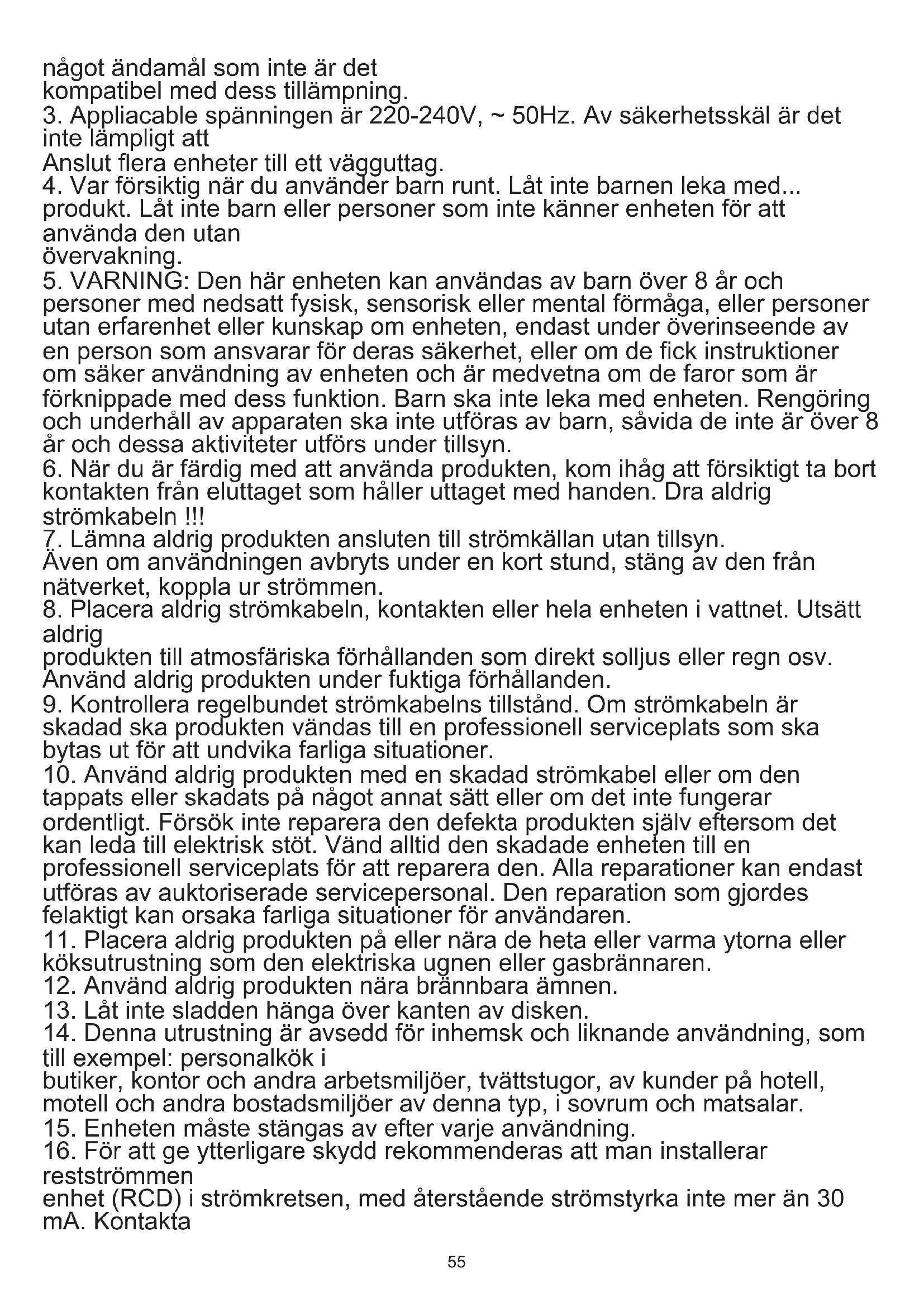 personer med nedsatt fysisk, sensorisk eller mental förmåga, eller personer utan erfarenhet eller kunskap om enheten, endast under överinseende av en person som ansvarar för deras säkerhet, eller om de fick instruktioner om säker användning av enheten och är medvetna om de faror som är förknippade med dess funktion. Barn ska inte leka med enheten. Rengöring och underhåll av apparaten ska inte utföras av barn, såvida de inte är över 8 år och dessa aktiviteter utförs under tillsyn.