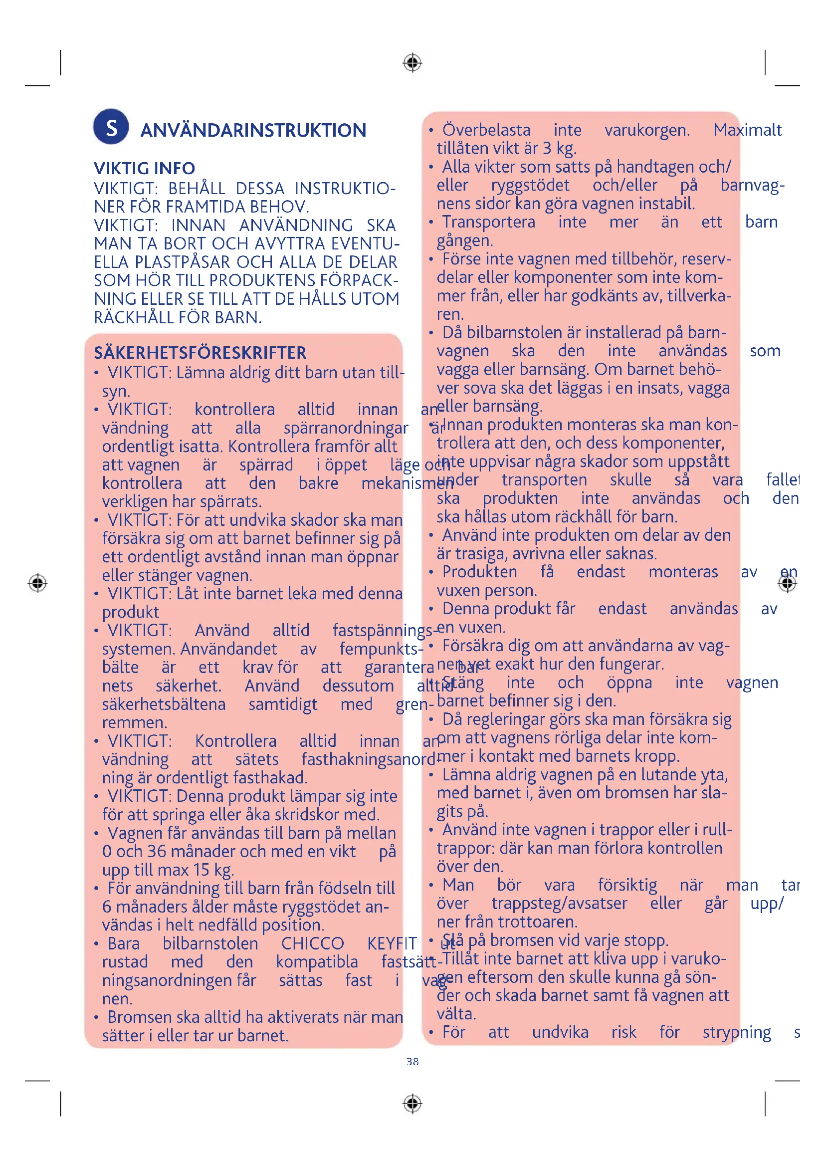 - VIKTIGT: kontrollera alltid innan an- vändning att alla spärranordningar är ordentligtisatta.Kontrolleraframförallt attvagnen är spärrad iöppet lägeoch kontrollera att den bakre mekanismen verkligenharspärrats.