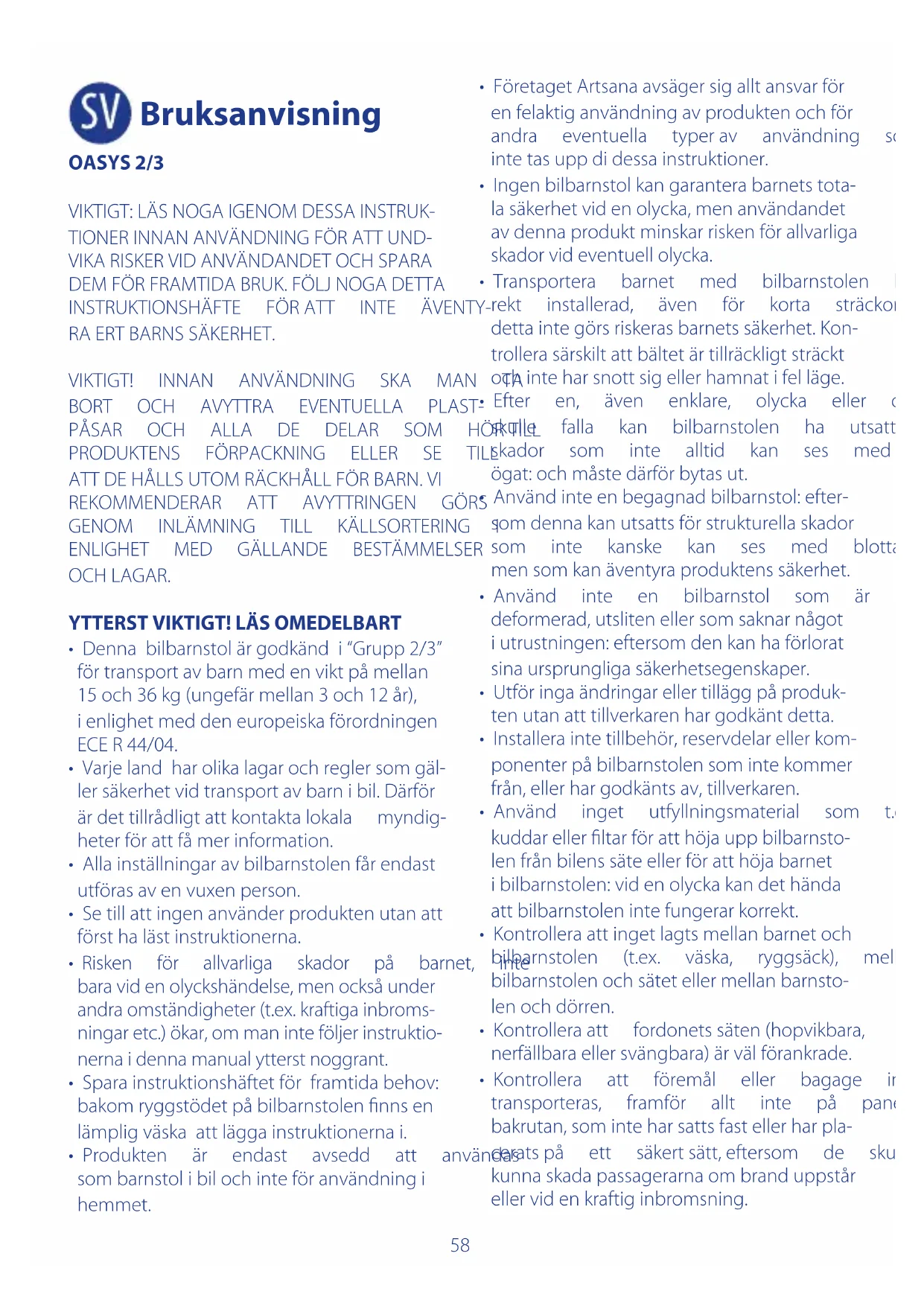 BILSÄTET VIKTIGT!Respekteramycketnogaföljandean- vändningsbegränsningar och krav avseende produktenochbilsätet:iannatfallgaranteras intesäkerheten.