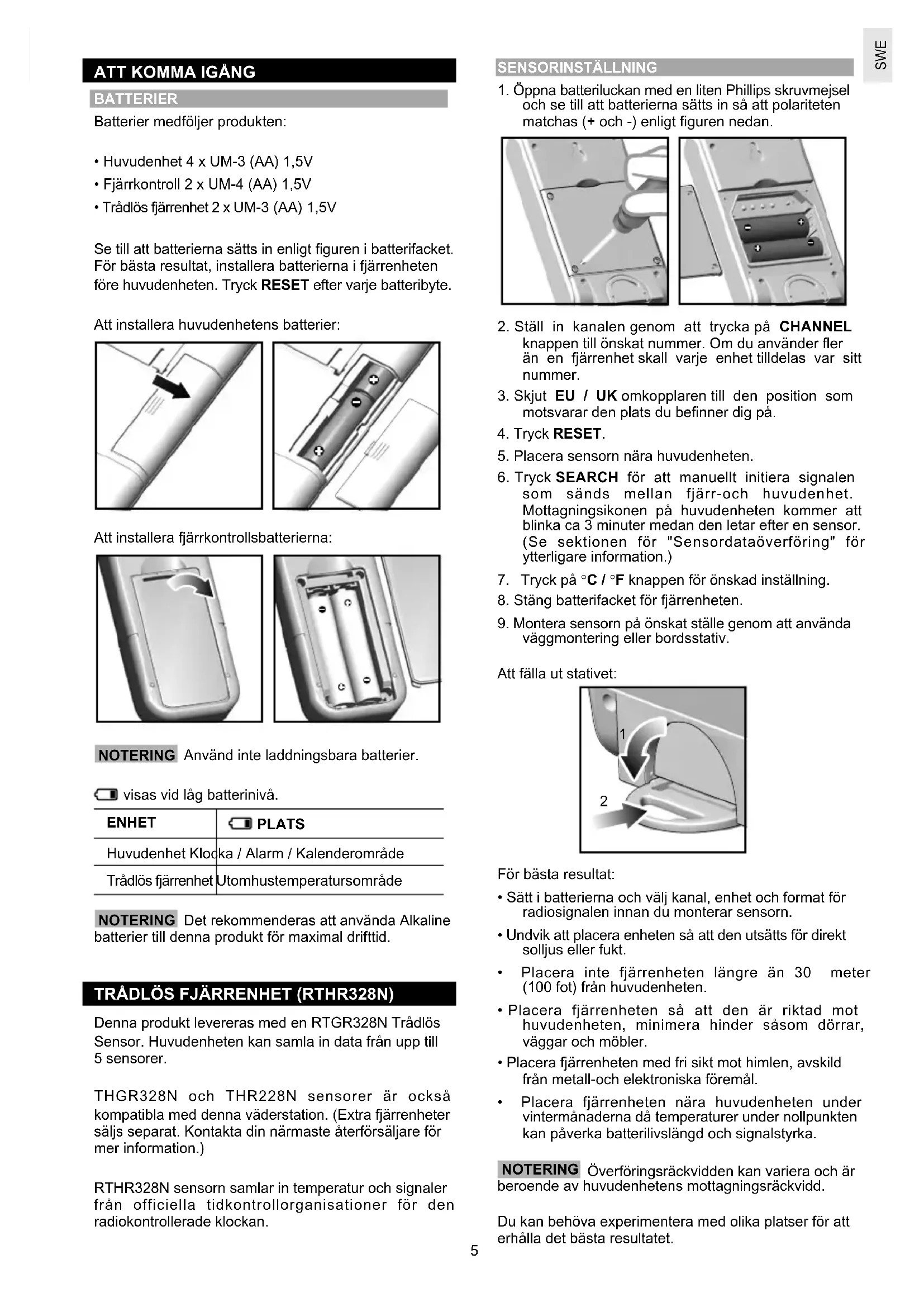 - Trådlös fjärrenhet 2 x UM-3 (AA) 1,5V Se till att batterierna sätts in enligt figuren i batterifacket. För bästa resultat, installera batterierna i fjärrenheten före huvudenheten. Tryck RESET efter varje batteribyte. Att installera huvudenhetens batterier: Att installera fjärrkontrollsbatterierna: ENHET PLATS Huvudenhet Klocka / Alarm / Kalenderområde Trådlös fjärrenhet Utomhustemperatursområde Använd inte laddningsbara batterier. visas vid låg batterinivå. Det rekommenderas att använda Alkaline batterier till denna produkt för maximal drifttid. TRÅDLÖS FJÄRRENHET (RTHR328N) Denna produkt levereras med en RTGR328N Trådlös Sensor. Huvudenheten kan samla in data från upp till 5 sensorer. THGR328N och THR228N sensorer är också kompatibla med denna väderstation. (Extra fjärrenheter säljs separat. Kontakta din närmaste återförsäljare för mer information.) RTHR328N sensorn samlar in temperatur och signaler från officiella tidkontrollorganisationer för den radiokontrollerade klockan. NOTERING SENSORINSTÄLLNING