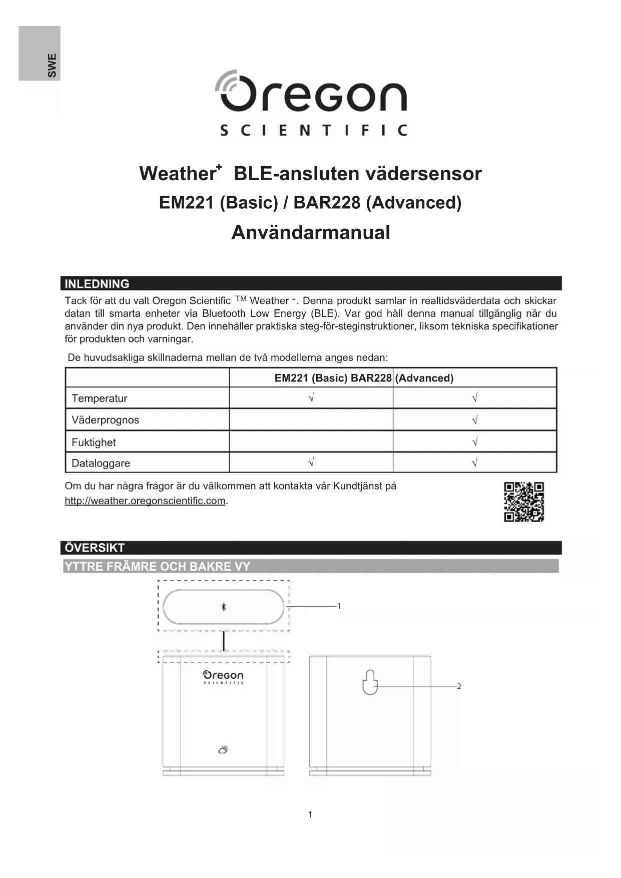 INLEDNING Tack för att du valt Oregon Scientic Weather . Denna produkt samlar in realtidsväderdata och skickar datan till smarta enheter via Bluetooth Low Energy (BLE). Var god håll denna manual tillgänglig när du använder din nya produkt. Den innehåller praktiska steg-för-steginstruktioner, liksom tekniska specikationer för produkten och varningar. De huvudsakliga skillnaderna mellan de två modellerna anges nedan: EM221 (Basic) BAR228 (Advanced) Temperatur