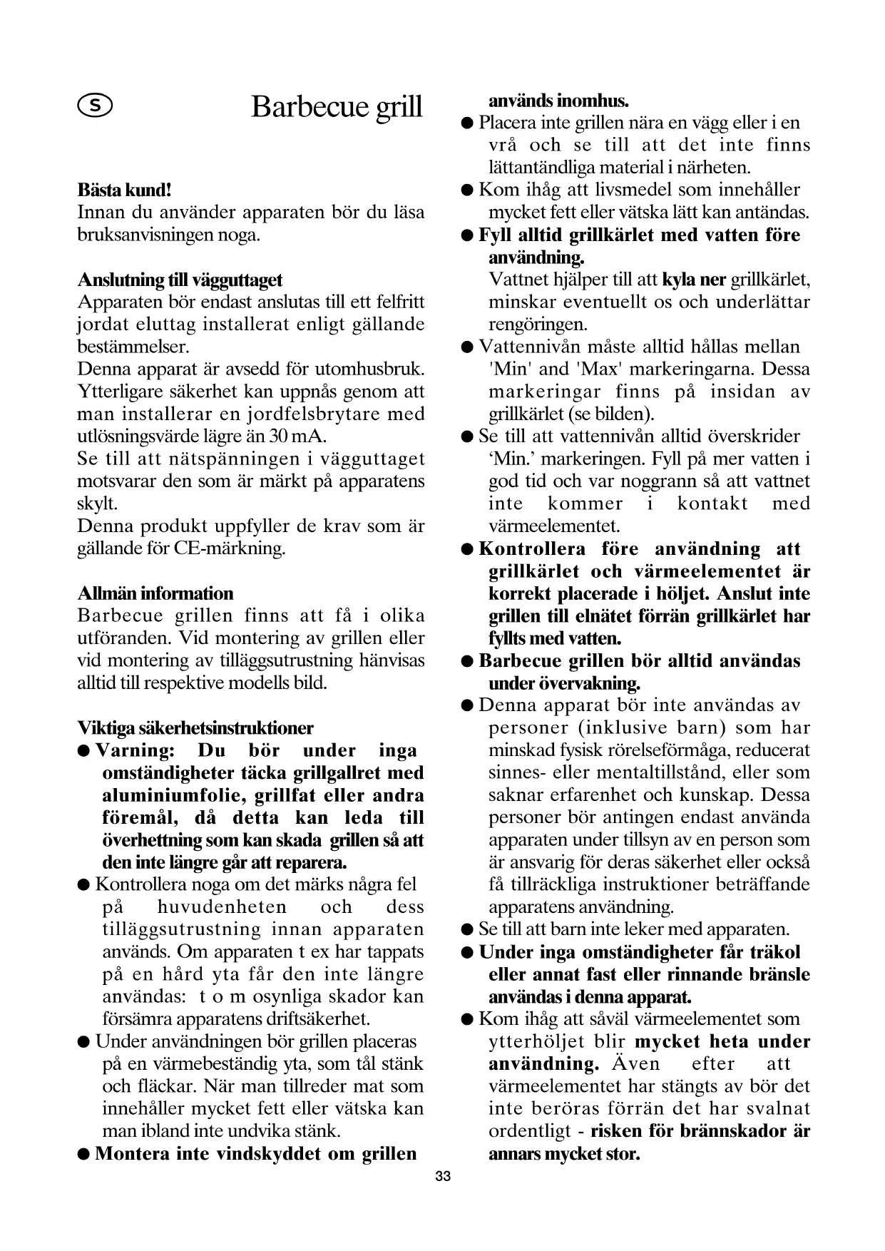 Bemærk venligst, at på de grill modeller hvor bradepanden er af aluminium vil denne blive misfarvet efter nogen tids brug. Dette er helt normalt og forhindrer ikke at grillen fortsat trygt kan benyttes. Opbevaring Efter rengøring bør grillen opbevares på et tørt sted indendørs. Bortskaffelse Gamle eller defekte apparater må aldrig smides ud sammen med husholdningsaffaldet, de skal afleveres på den lokale genbrugsstation. Garantierklæring På dette husholdningsprodukt overtager vi garantien i to år fra salgsdatoen. Garantien gælder for materiale- og fabrikationsfejl. Skader, der er opstået som følge af forkert behandling, normalt slid samt på skørbare dele som f.eks. glas, dækkes ikke af garantien. Denne garanti har ingen indvirkning på dine lovmæssige rettigheder, heller ikke de nationale forbrugerrettigheder om anskaffelse af varer. Hvis produktet ikke fungerer og må returneres, skal det pakkes forsvarligt ind, og navn, adresse samt årsagen til returneringen skal vedlægges. Hvis dette sker mens garantien stadig dækker, må garantibeviset og kvitteringen også lægges ved. Garantien bortfalder ligeledes ved indgreb på produktet af folk, der ikke er autoriseret af os. 32Bästa kund! Innan du använder apparaten bör du läsa bruksanvisningen noga. Anslutning till vägguttaget Apparaten bör endast anslutas till ett felfritt jordat eluttag installerat enligt gällande bestämmelser. Denna apparat är avsedd för utomhusbruk. Ytterligare säkerhet kan uppnås genom att man installerar en jordfelsbrytare med utlösningsvärde lägre än 30 mA. Se till att nätspänningen i vägguttaget motsvarar den som är märkt på apparatens skylt. Denna produkt uppfyller de krav som är gällande för CE-märkning. Allmän information Barbecue grillen finns att få i olika utföranden. Vid montering av grillen eller vid montering av tilläggsutrustning hänvisas alltid till respektive modells bild. Viktiga säkerhetsinstruktioner ● Varning: Du bör under inga omständigheter täcka grillgallret med aluminiumfolie, grillfat eller andra föremål, då detta kan leda till överhettning som kan skada grillen så att den inte längre går att reparera. ● Kontrollera noga om det märks några fel på huvudenheten och dess tilläggsutrustning innan apparaten används. Om apparaten t ex har tappats på en hård yta får den inte längre användas: t o m osynliga skador kan försämra apparatens driftsäkerhet. ● Under användningen bör grillen placeras på en värmebeständig yta, som tål stänk och fläckar. När man tillreder mat som innehåller mycket fett eller vätska kan man ibland inte undvika stänk. ● Montera inte vindskyddet om grillen används inomhus. ● Placera inte grillen nära en vägg eller i en vrå och se till att det inte finns lättantändliga material i närheten. ● Kom ihåg att livsmedel som innehåller mycket fett eller vätska lätt kan antändas. ● Fyll alltid grillkärlet med vatten före användning. Vattnet hjälper till att kyla ner grillkärlet, minskar eventuellt os och underlättar rengöringen. ● Vattennivån måste alltid hållas mellan 'Min' and 'Max' markeringarna. Dessa markeringar finns på insidan av grillkärlet (se bilden). ● Se till att vattennivån alltid överskrider ‘Min.’ markeringen. Fyll på mer vatten i god tid och var noggrann så att vattnet inte kommer i kontakt med värmeelementet. ● Kontrollera före användning att grillkärlet och värmeelementet är korrekt placerade i höljet. Anslut inte grillen till elnätet förrän grillkärlet har fyllts med vatten. ● Barbecue grillen bör alltid användas under övervakning. ● Denna apparat bör inte användas av personer (inklusive barn) som har minskad fysisk rörelseförmåga, reducerat sinnes- eller mentaltillstånd, eller som saknar erfarenhet och kunskap. Dessa personer bör antingen endast använda apparaten under tillsyn av en person som är ansvarig för deras säkerhet eller också få tillräckliga instruktioner beträffande apparatens användning. ● Se till att barn inte leker med apparaten. ● Under inga omständigheter får träkol eller annat fast eller rinnande bränsle användas i denna apparat. ● Kom ihåg att såväl värmeelementet som ytterhöljet blir mycket heta under användning. Även efter att värmeelementet har stängts av bör det inte beröras förrän det har svalnat ordentligt - risken för brännskador är annars mycket stor.