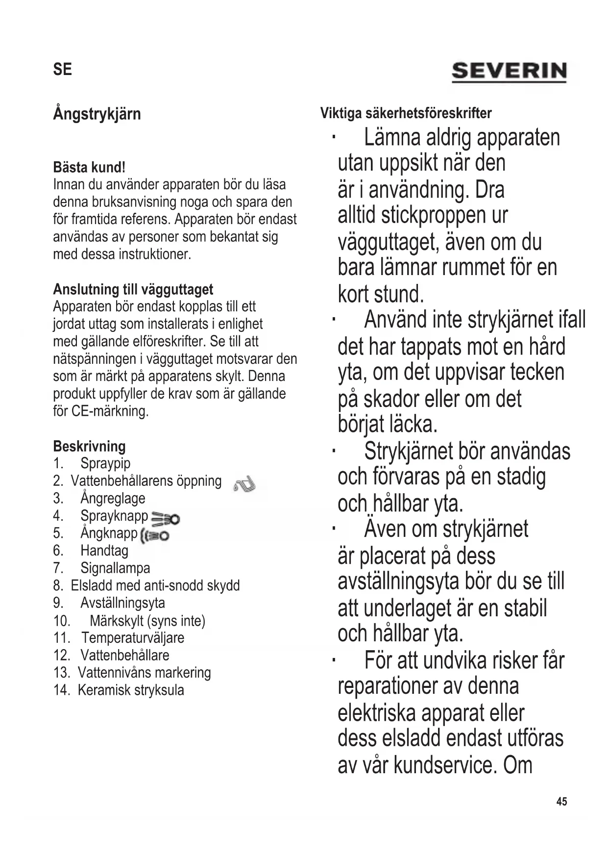 temperaturer. ∙ Placera ångstrykjärnet på dess avställningsyta efter användning och dra stickproppen ur vägguttaget. Ångduschknapp ∙ När ångknappen trycks in, strömmar ytterligare ånga ut genom hålen i stryksulan. Denna funktion kan vara mycket användbar när den normala ångmängden som avges inte är tillräcklig för att avlägsna envisa veck eller när man stryker svåra eller tjocka material. ∙ Ångstrålens funktion kan också användas medan strykjärnet hålls vertikalt för att avlägsna tygveck eller –rynkor. Spraypip Om tyget man stryker är för torrt kan man tillföra vatten genom att trycka på sprayknappen . Detta är till stor hjälp när man stryker hårt skrynkliga tyger. Spraypipen kan användas med vilken temperaturinställning som helst under torr- eller ångstrykning. Underhåll och rengöring ∙ Dra alltid stickproppen ur vägguttaget och se till att apparaten är avstängd innan rengöring påbörjas. ∙ På grund av risken för elektrisk stöt bör apparaten inte rengöras eller doppas i vatten. ∙ Vid behov kan apparatens hölje torkas av med en torr trasa som inte avger ludd. ∙ Fett o dyl avlagringar som fastnat på stryksulan kan avlägsnas med en trasa som doppats i en blandning av ättika och vatten. ∙ Repande eller frätande rengöringsmedel får inte användas. ∙ Häll aldrig ättika eller motsvarande avkalkningsmedel i vattenbehållaren. Självrengöringssystem Självrengöringssystemet spolar bort lösa mineraler och håller apparaten fri från kalk- och dammpartiklar. Självrengöring bör utföras då apparaten inte har använts under en längre period eller vid normal användning var 10-15:e dag. Gör som följer: ∙ Fyll vattenbehållaren till hälften med vatten. ∙ Placera strykjärnet på dess avställningsyta och sätt stickproppen i vägguttaget. ∙ Ställ in temperaturknappen på max temperatur. ∙ Vrid ångreglageknappen till dess torrstrykningsposition. ∙ Vänta tills signallampan slocknar. ∙ Dra stickproppen ur vägguttaget. ∙ Håll strykjärnet horisontellt över diskhon. ∙ Vrid ångreglaget till dess CLEAN- position och tryck in det. ∙ När ångreglaget är intryckt svänger du strykjärnet fram och tillbaka i luften tills all ånga eller allt hett vatten i strykjärnet är borta. ∙ Häll eventuellt kvarvarande vatten ur behållaren. ∙ Låt stryksulan svalna innan du rengör den med en fuktad, luddfri duk.50 104 x 142 mm Förvaring ∙ Stäng av ångstrykjärnet, dra stickproppen ur vägguttaget och låt apparaten avsvalna helt. ∙ Häll ut eventuellt vatten ur behållaren genom påfyllningsöppningen. ∙ Förvara alltid strykjärnet i upprätt position på dess avställningsyta för att inte skada stryksulan. Avfallshantering Enheter märkta med denna symbol måste kasseras separat från hushållsavfallet, eftersom de innehåller värdefulla material som kan återvinnas. Korrekt avfallshantering skyddar miljön och människors hälsa. Din lokala myndighet eller återförsäljare kan ge information i ärendet. Garanti i Sverige och Finland För material- och tillverkningsfel gäller 2 års garanti räknat från inköpsdagen mot uppvisandeavspeciceratinköpskvitto i överensstämmelse med de allmänna garantivillkoren. Denna garanti inverkar inte på dina lagstadgade rättigheter eller dina lagenliga rättigheter enligt den nationella konsumentskyddslagstiftningen. Ifall apparaten används felaktigt, eller vårdslöst, ansvarar den som använder apparaten för eventuella material- och personskador. Tillverkas för: Severin Elektrogeräte GmbH, Tyskland.104 x 142 mm