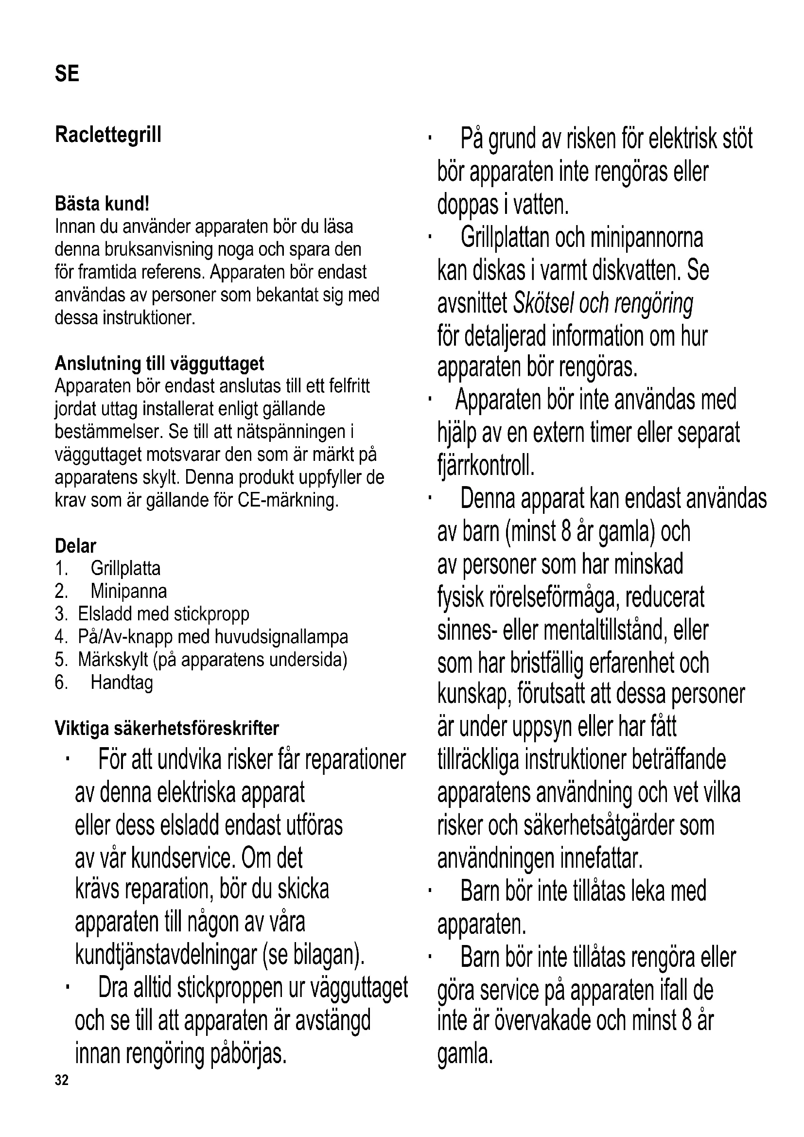 Viktiga säkerhetsföreskrifter ∙ För att undvika risker får reparationer av denna elektriska apparat eller dess elsladd endast utföras av vår kundservice. Om det krävs reparation, bör du skicka apparaten till någon av våra kundtjänstavdelningar (se bilagan). ∙ Dra alltid stickproppen ur vägguttaget och se till att apparaten är avstängd innan rengöring påbörjas. ∙ På grund av risken för elektrisk stöt bör apparaten inte rengöras eller doppas i vatten. ∙ Grillplattan och minipannorna kan diskas i varmt diskvatten. Se avsnittet Skötsel och rengöring för detaljerad information om hur apparaten bör rengöras. ∙ Apparaten bör inte användas med hjälp av en extern timer eller separat fjärrkontroll. ∙ Denna apparat kan endast användas av barn (minst 8 år gamla) och av personer som har minskad fysisk rörelseförmåga, reducerat sinnes- eller mentaltillstånd, eller som har bristfällig erfarenhet och kunskap, förutsatt att dessa personer är under uppsyn eller har fått tillräckliga instruktioner beträffande apparatens användning och vet vilka risker och säkerhetsåtgärder som användningen innefattar. ∙ Barn bör inte tillåtas leka med apparaten. ∙ Barn bör inte tillåtas rengöra eller göra service på apparaten ifall de inte är övervakade och minst 8 år gamla. SE33 ∙ Apparaten och dess elsladd bör hållas utom räckhåll för barn under 8 år. ∙ Varning: Håll barn på avstånd från apparatens förpackningsmaterial eftersom fara eventuellt kan uppstå. Det fi nns t.ex. risk för kvävning. ∙ Kontrollera noga om det märks några fel på huvudenheten och dess tillbehör innan du använder apparaten. Om apparaten t. ex. har tappats på en hård yta får den inte längre användas: t.o.m. osynliga skador kan försämra apparatens driftsäkerhet. ∙ Kontrollera regelbundet att elsladden inte blivit skadad. Om sladden har skadats får apparaten inte längre användas. ∙ Sladden måste hållas på säkert avstånd från apparatens heta delar. ∙ Varning: Risk för brännskada. Höljet, grillytorna och minipannorna blir heta under användning. ∙ Apparaten bör alltid vara under uppsikt när den är i användning. ∙ Under användningen bör apparaten placeras på en värmebeständig yta, som tål stänk och fl äckar. När man tillreder mat som innehåller mycket fett eller vätska kan man ibland inte undvika stänk. ∙ Placera inte grillen nära en vägg eller i en vrå och se till att det inte fi nns lättantändliga material i närheten. ∙ Innan apparaten kopplas på, bör grillplattan placeras ovanpå apparaten och låsas på plats, ovanför värmeelementet. ∙ Varning: använd inte apparaten utomhus. ∙ Dra alltid stickproppen ur vägguttaget - efter användning, - ifall apparaten skulle krångla, - innan apparaten rengörs. ∙ Tag stickproppen ur vägguttaget genom att dra i stickproppen, aldrig i sladden. ∙ Denna apparat bör endast användas med den utrustning som medföljt apparaten. ∙ Låt alltid apparaten svalna innan du avlägsnar grillplattan och innan du rengör apparaten eller sätter den i förvaring. ∙ Om apparaten använts felaktigt eller om bruksanvisningen inte följts, kan inga krav ställas mot leverantören eller försäljaren. ∙ Apparaten är avsedd för hemmabruk eller liknande användning, såsom - i kontor och andra kommersiella miljöer, - inom jordbrukssektorn, - för kunder i hotell, motell och andra liknande anläggningar, - för kunder i bed-and-breakfast hus. Innan första användningen ∙ Avlägsna allt förpackningsmaterial fullständigt. ∙ Innan du kopplar på grillen för första gången bör du rengöra grillplattan och minipannorna med en fuktad duk. ∙ Vi rekommenderar att du låter apparaten och minipannorna värma upp ca. 15 minuter utan några matprodukter för att få bort den “nya” lukt som vanligen uppstår när apparaten kopplas på för första gången. En liten mängd rök kan också synas och därför bör du öppna fönstren eller balkongdörren. ∙ Låt grillen svalna. ∙ Rengör den enligt beskrivningen i avsnittet Skötsel och rengöring. Grillplatta Innan du kopplar på apparaten, placerar du grillplattan ovanpå apparaten ovanför värmeelementet och låser den på plats. Du låser den på plats genom att trycka34 grillplattan neråt och fl ytta den mot symbolen så att de utbuktande dubbarna säkrar låsningen. Lossa plattan genom att trycka den uppåt mot symbolen. Användning ∙ Placera grillplattan på enheten på det sätt som beskrivs ovan. Anslut stickproppen till ett lämpligt eluttag och koppla på apparaten. ∙ Efter en uppvärmningstid på ca 10 minuter är apparaten färdig att användas. Placera maten som skall tillredas på grillplattan. Vi rekommenderar att du först tillsätter ett tunt lager olja på plattan för att förhindra att maten fastnar. ∙ Sätt racletteosten i minipannorna. Placera minipannorna i apparaten, under värmeelementena, och lämna dem tills osten har smält. Varning: Placera inte tomma minipannor i apparaten när den är påkopplad, du bör lägga dem på en värmetålig yta. ∙ Stäng av apparaten och dra stickproppen ur vägguttaget efter användningen. Så tillagar du racletteosten Använd ca 200-300 gram ost per person. Skär den i ca 3-5 mm tjocka skivor och placera dem i minipannorna. Vi rekommenderar att du använder racletteost men det går även bra med annan ost som är lätt att smälta. Praktiska tips ∙ Fryst mat skall alltid tinas ordentligt innan du tillagar den. ∙ Undvik skador på minipannornas och grillplattans ytor genom att bara använda redskap i trä eller värmetålig plast vid grillningen. Skötsel och rengöring ∙ Innan du rengör din raclettegrill bör du alltid se till att sladden inte är ansluten till vägguttaget och att apparaten har svalnat ordentligt. ∙ För att undvika elektrisk stöt bör du aldrig tvätta apparaten med vatten eller doppa den i vatten. ∙ Använd i