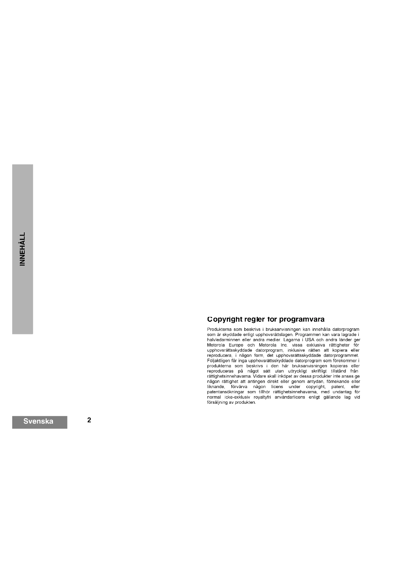 r programvara Produkterna som beskrivs i bruksanvisningen kan innehålla datorprogram som är skyddade enligt upphovsrättslagen. Programmen kan vara lagrade i halvledarminnen eller andra medier. Lagarna i USA och andra länder ger Motorola Europe och Motorola Inc. vissa exklusiva rättigheter för upphovsrättsskyddade datorprogram, inklusive rätten att kopiera eller reproducera, i någon form, det upphovsrättsskyddade datorprogrammet. Följaktligen får inga upphovsrättsskyddade datorprogram som förekommer i produkterna som beskrivs i den här bruksanvisningen kopieras eller reproduceras på något sätt utan uttryckligt skriftligt tillstånd från rättighetsinnehavarna. Vidare skall inköpet av dessa produkter inte anses ge någon rättighet att antingen direkt eller genom antydan, förnekande eller liknande, förvärva någon licens under copyright, patent, eller patentansökningar som tillhör rättighetsinnehavarna, med undantag för normal icke-exklusiv royaltyfri användarlicens enligt gällande lag vid försäljning av produkten. CP040_SV.fm Page 2 Thursday, October 2, 2003 11:24 AM3 Svenska RADIOÖVERSIKT RADIOÖVERSIKT Denna bruksanvisning redogör för användningen av bärbara radioapparater typ CP040. OBS! För att kraven för exponering för RF-energi enligt ICNIRP ska uppfyllas får denna radio endast användas yrkesmässigt. Innan du använder produkten ska du läsa informationen om RF-energimedvetenhet och driftsinstruktionerna i häftet Säkerhet och RF-exponering (Motorolas publikationsnummer 6864117B25_), för säkerställande av kompatibilitet med gränserna för exponering för RF-energi.