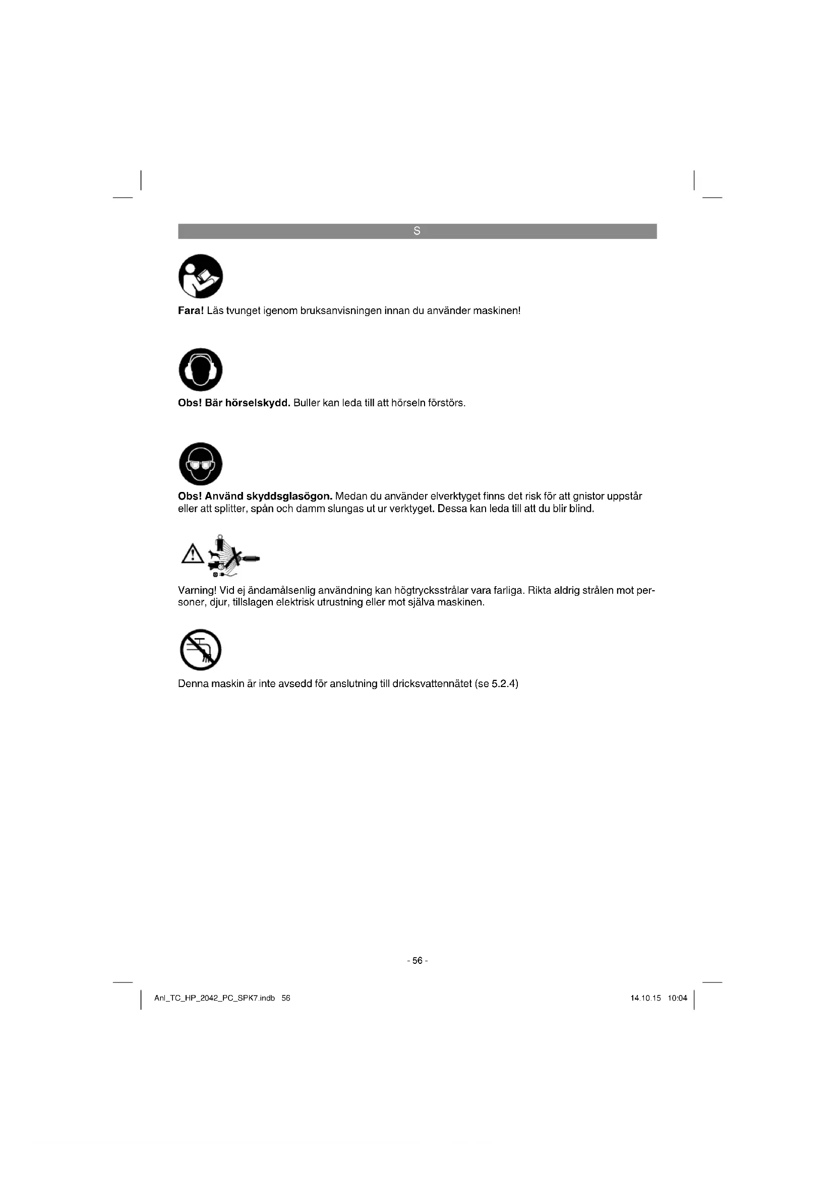 Obs! Bär hörselskydd. Buller kan leda till att hörseln förstörs. Obs! Använd skyddsglasögon. Medan du använder elverktyget fi nns det risk för att gnistor uppstår eller att splitter, spån och damm slungas ut ur verktyget. Dessa kan leda till att du blir blind. Fara! Läs tvunget igenom bruksanvisningen innan du använder maskinen! Varning! Vid ej ändamålsenlig användning kan högtrycksstrålar vara farliga. Rikta aldrig strålen mot per- soner, djur, tillslagen elektrisk utrustning eller mot själva maskinen. Denna maskin är inte avsedd för anslutning till dricksvattennätet (se 5.2.4) Anl_TC_HP_2042_PC_SPK7.indb 56Anl_TC_HP_2042_PC_SPK7.indb 56 14.10.15 10:0414.10.15 10:04S