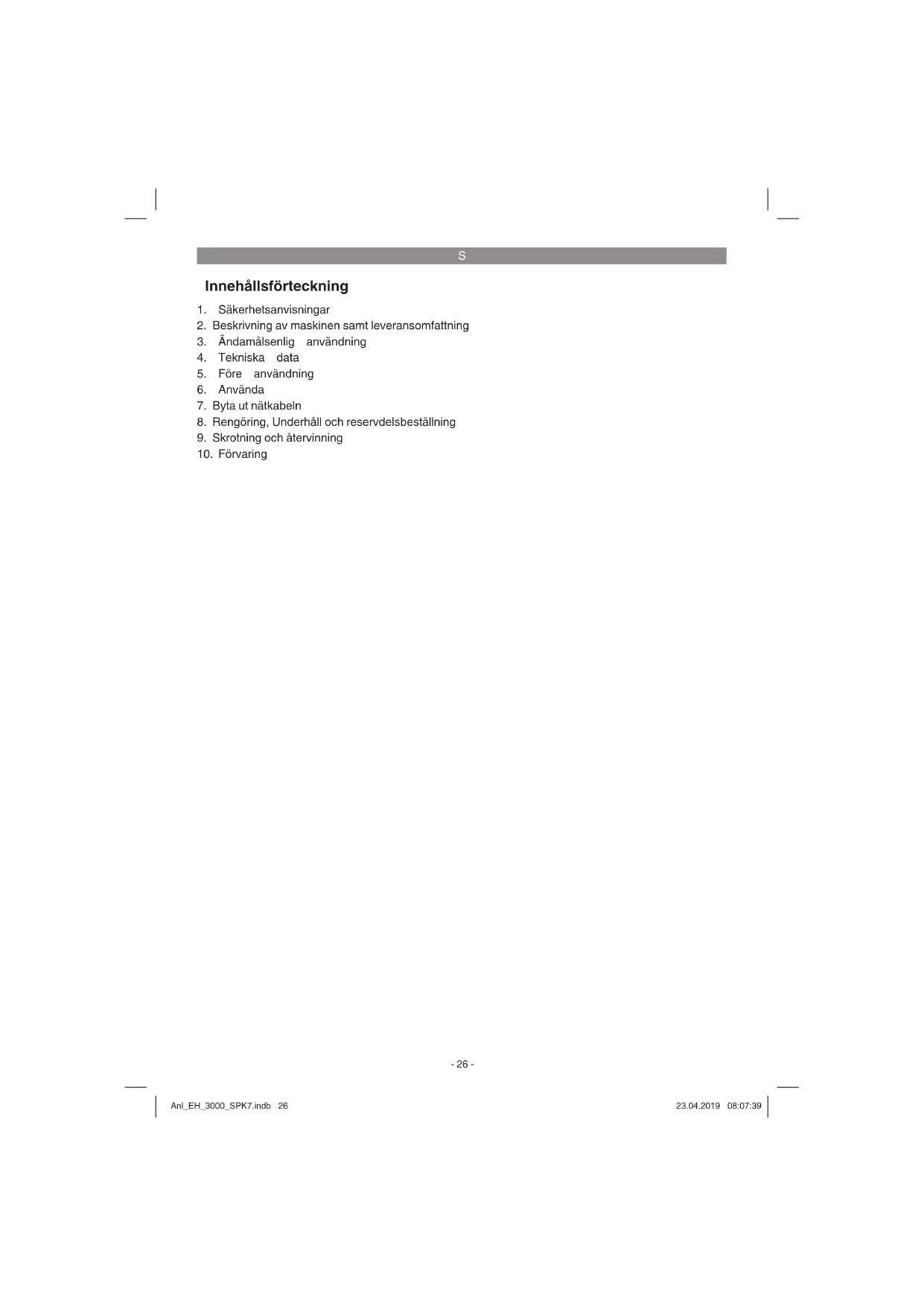 Förvara produkten och dess tillbehör på en mörk, torr och frostfri plats samt otillgängligt för barn. Den bästa förvaringstemperaturen är mellan 5 och 30˚C. Förvara elverktyget i originalförpack- ningen. Endast för EU-länder Kasta inte elverktyg i hushållssoporna. Enligt det europeiska direktivet 2012/19/EG om avfall som utgörs av eller innehåller elektriska eller elektroniska produkter och dess tillämpning i den nationella lagstiftningen, måste förbrukade elverktyg källsorteras och lämnas in för miljövän- lig återvinning. Återvinnings-alternativ till begäran om återsänd- ning: Som ett alternativ till returnering är ägaren av elut- rustningen skyldig att bidraga till ändamålsenlig avfallshantering för det fall att utrustningen ska skrotas. Efter att den förbrukade utrustningen har lämnats in till en avfallsstation kan den omhänder- tas i enlighet med gällande nationella lagstiftning om återvinning och avfallshantering. Detta gäller inte för tillbehörsdelar och hjälpmedel utan elekt- riska komponenter vars syfte har varit att komplet- tera den förbrukade utrustningen. Eftertryck eller annan duplicering av dokumenta- tion och medföljande underlag för produkterna, även utdrag, är endast tillåtet med uttryckligt tillstånd från iSC GmbH. Med förbehåll för tekniska ändringar. Anl_EH_3000_SPK7.indb 31Anl_EH_3000_SPK7.indb 31 23.04.2019 08:07:4023.04.2019 08:07:40S