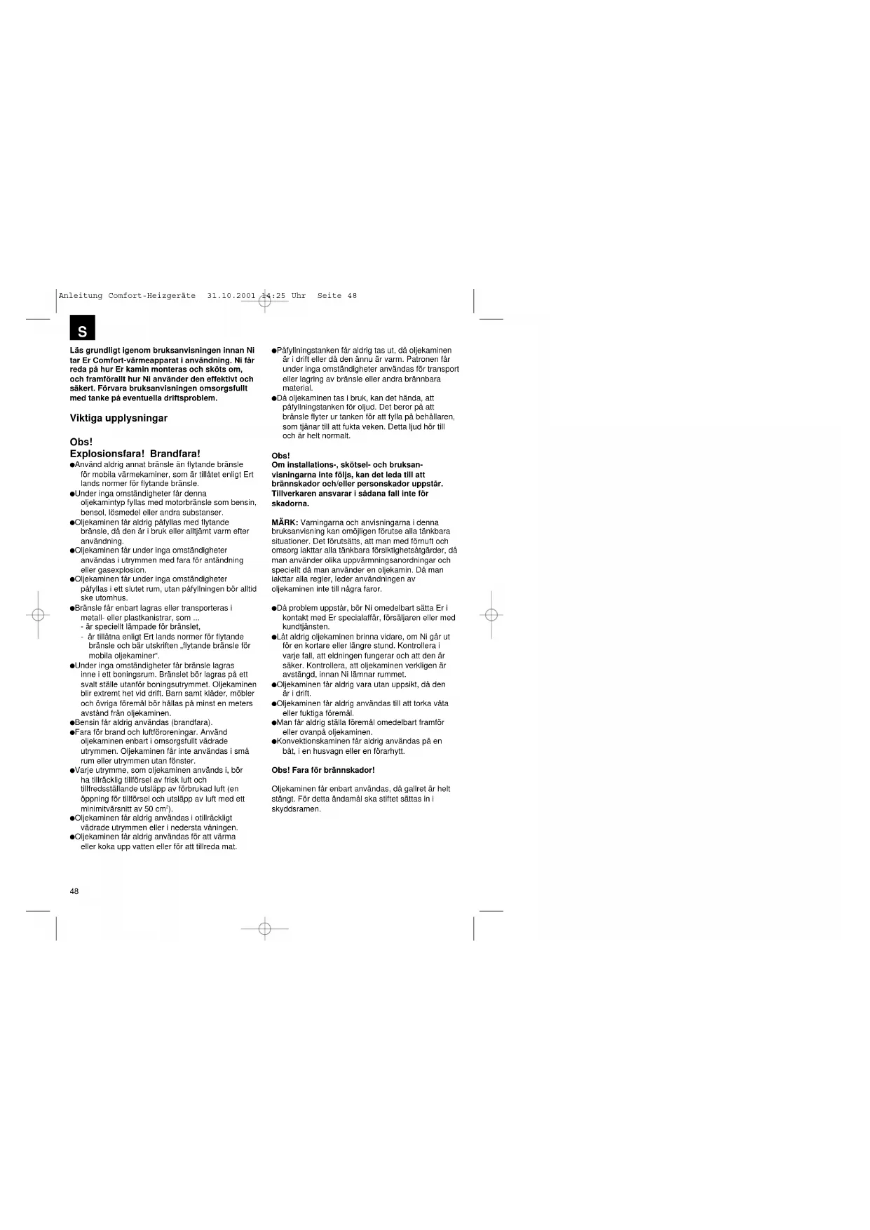 Anleitung Comfort-Heizgeräte 31.10.2001 14:25 Uhr Seite 47Läs grundligt igenom bruksanvisningen innan Ni tar Er Comfort-värmeapparat i användning. Ni får reda på hur Er kamin monteras och sköts om, och framförallt hur Ni använder den effektivt och säkert. Förvara bruksanvisningen omsorgsfullt med tanke på eventuella driftsproblem. Viktiga upplysningar Obs! Explosionsfara! Brandfara! Använd aldrig annat bränsle än flytande bränsle för mobila värmekaminer, som är tillåtet enligt Ert lands normer för flytande bränsle. Under inga omständigheter får denna oljekamintyp fyllas med motorbränsle som bensin, bensol, lösmedel eller andra substanser. Oljekaminen får aldrig påfyllas med flytande bränsle, då den är i bruk eller alltjämt varm efter användning. Oljekaminen får under inga omständigheter användas i utrymmen med fara för antändning eller gasexplosion. Oljekaminen får under inga omständigheter påfyllas i ett slutet rum, utan påfyllningen bör alltid ske utomhus. Bränsle får enbart lagras eller transporteras i metall- eller plastkanistrar, som ... - är speciellt lämpade för bränslet, - är tillåtna enligt Ert lands normer för flytande bränsle och bär utskriften „flytande bränsle för mobila oljekaminer“. Under inga omständigheter får bränsle lagras inne i ett boningsrum. Bränslet bör lagras på ett svalt ställe utanför boningsutrymmet. Oljekaminen blir extremt het vid drift. Barn samt kläder, möbler och övriga föremål bör hållas på minst en meters avstånd från oljekaminen. Bensin får aldrig användas (brandfara). Fara för brand och luftföroreningar. Använd oljekaminen enbart i omsorgsfullt vädrade utrymmen. Oljekaminen får inte användas i små rum eller utrymmen utan fönster. Varje utrymme, som oljekaminen används i, bör ha tillräcklig tillförsel av frisk luft och tillfredsställande utsläpp av förbrukad luft (en öppning för tillförsel och utsläpp av luft med ett minimitvärsnitt av 50 cm