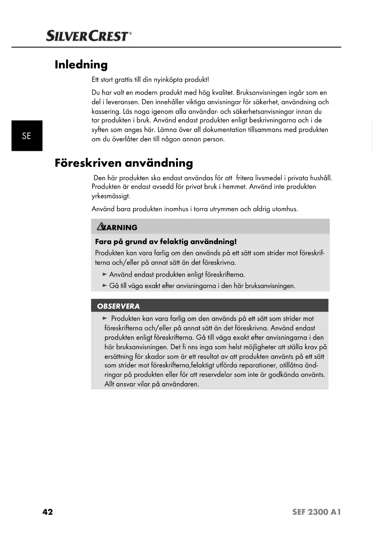 Inledning Ett stort grattis till din nyinköpta produkt! Du har valt en modern produkt med hög kvalitet. Bruksanvisningen ingår som en del i leveransen. Den innehåller viktiga anvisningar för säkerhet, användning och kassering. Läs noga igenom alla användar- och säkerhetsanvisningar innan du tar produkten i bruk. Använd endast produkten enligt beskrivningarna och i de syften som anges här. Lämna över all dokumentation tillsammans med produkten om du överlåter den till någon annan person. Föreskriven användning Den här produkten ska endast användas för att fritera livsmedel i privata hushåll. Produkten är endast avsedd för privat bruk i hemmet. Använd inte produkten yrkesmässigt. Använd bara produkten inomhus i torra utrymmen och aldrig utomhus. VARNING Fara på grund av felaktig användning! Produkten kan vara farlig om den används på ett sätt som strider mot föreskrif- terna och/eller på annat sätt än det föreskrivna. ► Använd endast produkten enligt föreskrifterna. ► Gå till väga exakt efter anvisningarna i den här bruksanvisningen. OBSERVERA ► Produkten kan vara farlig om den används på ett sätt som strider mot för eskrifterna och/eller på annat sätt än det föreskrivna. Använd endast produkten enligt föreskrifterna. Gå till väga exakt efter anvisningarna i den här bruksanvisningen. Det fi nns inga som helst möjligheter att ställa krav på ersättning för skador som är ett resultat av att produkten använts på ett sätt som strider mot föreskrifterna,felaktigt utförda reparationer, otillåtna änd- ringar på produkten eller för att reservdelar som inte är godkända använts. Allt ansvar vilar på användaren. IB_102781_SEF2300A1_FI_BE_NL.indb 42IB_102781_SEF2300A1_FI_BE_NL.indb 42 25.08.14 09:3125.08.14 09:3143 SEF 2300 A1