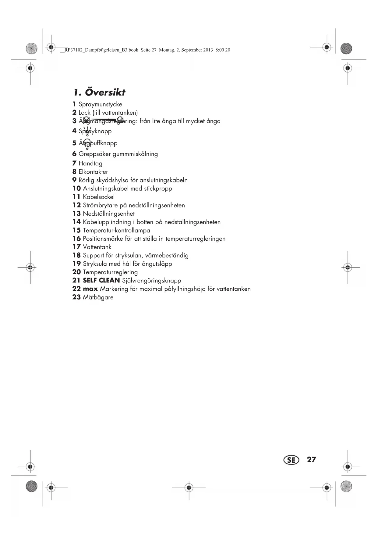 1 Spraymunstycke 2 Lock (till vattentanken) 3 Ångmängdsreglering: från lite ånga till mycket ånga 4 Sprayknapp 5 Ångpuffknapp 6 Greppsäker gummmiskålning 7 Handtag 8 Elkontakter 9 Rörlig skyddshylsa för anslutningskabeln 10 Anslutningskabel med stickpropp 11 Kabelsockel 12 Strömbrytare på nedställningsenheten 13 Nedställningsenhet 14 Kabelupplindning i botten på nedställningsenheten 15 Temperatur-kontrollampa 16 Positionsmärke för att ställa in temperaturregleringen 17 Vattentank 18 Support för stryksulan, värmebeständig 19 Stryksula med hål för ångutsläpp 20 Temperaturreglering 21 SELF CLEAN Självrengöringsknapp 22 max Markering för maximal påfyllningshöjd för vattentanken 23 Mätbägare __RP37102_Dampfbügeleisen_B3.book Seite 27 Montag, 2. September 2013 8:00 2028
