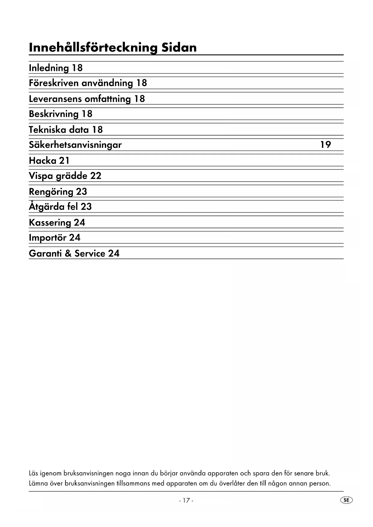 BURGSTRASSE 21 44867 BOCHUM GERMANY www.kompernass.com Takuu ja huolto Laitteen takuu on 3 vuotta ostopäivästä. Laite on valmistettu huolellisesti ja tarkistettu tarkasti ennen toimitusta. Säilytä ostokuitti todisteeksi takuun voi- massaolosta. Ota takuutapauksessa puhelimitse yhteyttä huoltopi- steeseesi. Vain näin voidaan taata tuotteesi maksuton lähettäminen huoltoon. Takuu koskee ainoastaan materiaali- ja valmistusvir- heitä, ei kuitenkaan kuljetusvaurioita, kuluvia osia tai herkästi vaurioituvien osien, esim. kytkinten tai akku- jen vaurioita. Tuote on tarkoitettu ainoastaan yksityiseen, ei kau- palliseen käyttöön. Väärä tai asiaton käyttö, väkivallan käyttö ja muiden kuin valtuutetun huoltopisteen suorittamat korjaukset aiheuttavat takuun raukeamisen. Tämä takuu ei rajo- ita kuluttajan lakisääteisiä oikeuksia. Takuukorjaus ei pidennä takuuaikaa. Tämä koskee myös vaihdettuja ja korjattuja osia. Mahdollisista jo ostettaessa olemassa olevista vahingoista ja puuttei- sta on ilmoitettava välittömästi pakkauksesta purka- misen jälkeen, kuitenkin viimeistään kaksi päivää ostopäiväyksen jälkeen. Takuuajan jälkeen suoritetut korjaukset ovat maksullisia. Huolto Suomi Tel.: 010309 3582 E-Mail: kompernass@lidl.fi Palvelupuhelin: Maanantaista perjantaihin klo 8:00 – 20:00 (CET) IAN 105261- 17 - Innehållsförteckning Sidan Inledning 18 Föreskriven användning 18 Leveransens omfattning 18 Beskrivning 18 Tekniska data 18 Säkerhetsanvisningar 19 Hacka 21 Vispa grädde 22 Rengöring 23 Åtgärda fel 23 Kassering 24 Importör 24 Garanti & Service 24 Läs igenom bruksanvisningen noga innan du börjar använda apparaten och spara den för senare bruk. Lämna över bruksanvisningen tillsammans med apparaten om du överlåter den till någon annan person.- 18 - Multimixer Inledning Ett stort grattis till din nyinköpta produkt. Du har valt en produkt med hög kvalitet. Bruksanvis- ningen ingår som en del av leveransen. Den inne- håller viktig information om säkerhet, användning och återvinning. Läs noga igenom alla användar- och säkerhetsanvisningar innan du börjar använda pro- dukten. Använd endast produkten enligt beskrivnin- garna och i de syften som anges här. Ta väl vara på den här bruksanvisningen. Lämna över all doku- mentation tillsammans med produkten om du överlåter den till någon annan person. Föreskriven användning Den här produkten ska endast användas för att hacka små mängder av benfria livsmedel samt för att vispa grädde. Produkten är endast avsedd för privat bruk i hemmet. I föreskriven användning ingår även att läsa och följa alla anvisningar i den här bruksanvisningen, i synnerhet säkerhetsanvisningar- na. All övrig användning räknas som ej föreskriven och kan leda till skador på material och i värsta fall på person. Vi ansvarar inte för skador som är ett re- sultat av felaktig användning. Leveransens omfattning Multimixer Knivhållare med kniv Visp Bruksanvisning Beskrivning Bild A: 1 Turboknapp 2 Motorblock 3 Ring till locket 4 Lock 5 Knivhållare 6 Skål 7 Kniv 8 Fäste 9 Fot 0 Visp Tekniska data Nätspänning: 220-240 V