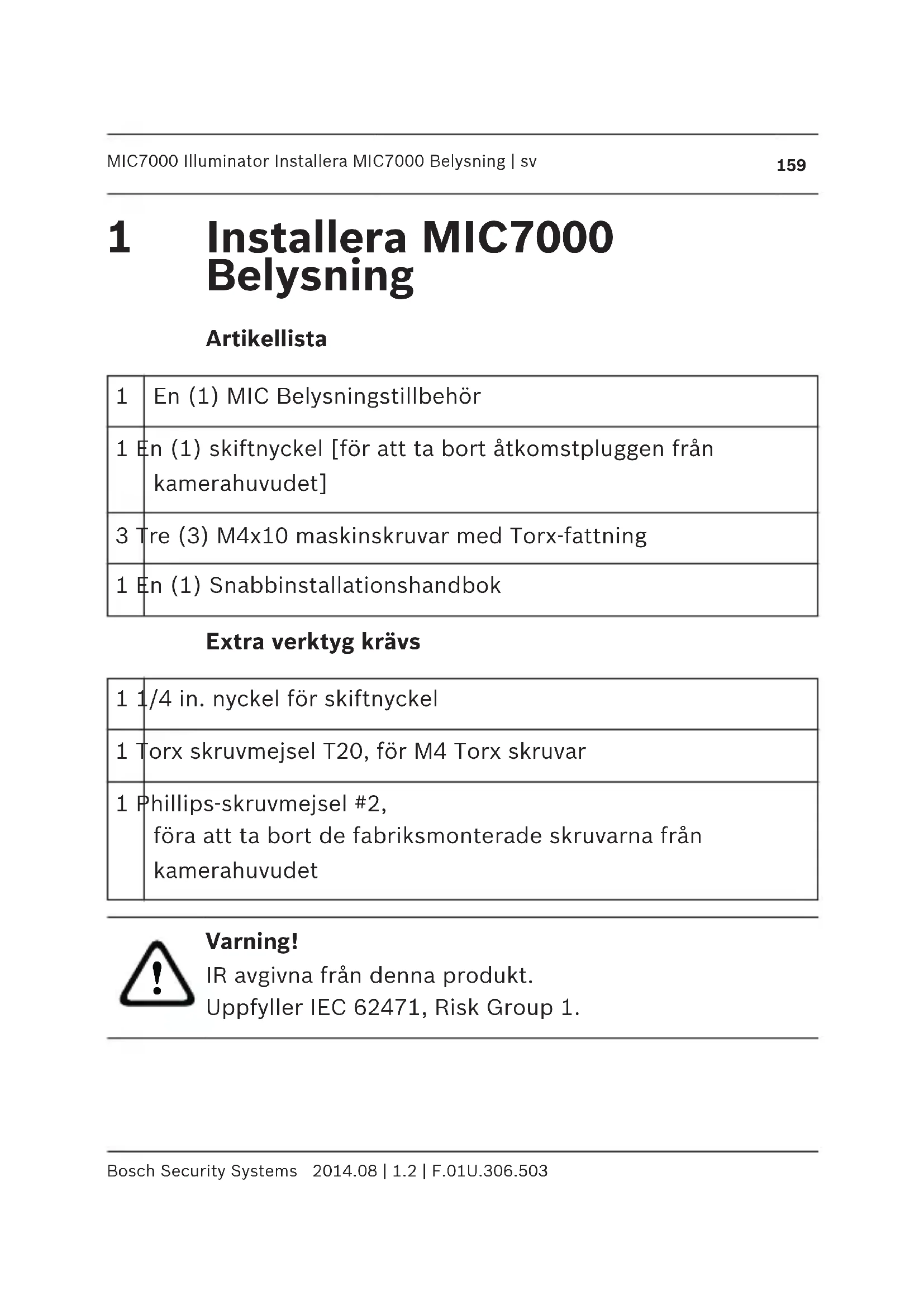 Bosch Security Systems 2014.08 | 1.2 | F.01U.306.503Obs! Den här produkten har testats enligt standarden IEC62471:2006 "fotobiologisk säkerhet för lampor och lampsystem". Produktens utsläpp överstiger den UNDANTAGNA gruppens gräns för både risk för blåljusskada på näthinnan och infraröd strålningsskada på hornhinna/lins enligt definitionen i IEC 62471:2006. Produkten bedömdes uppfylla exponeringsvärden i Riskgrupp 1 för IR och vita lysdioder. Se MIC7000 instruktionsboken för fullständig information om belysningssäkerhet. Obs! Om MIC kameran kommer att både belysnings- och solskyddstillbehör, montera belysningen först. MIC7000 modeller för extremt låga temperaturer stöder inte belysningen.