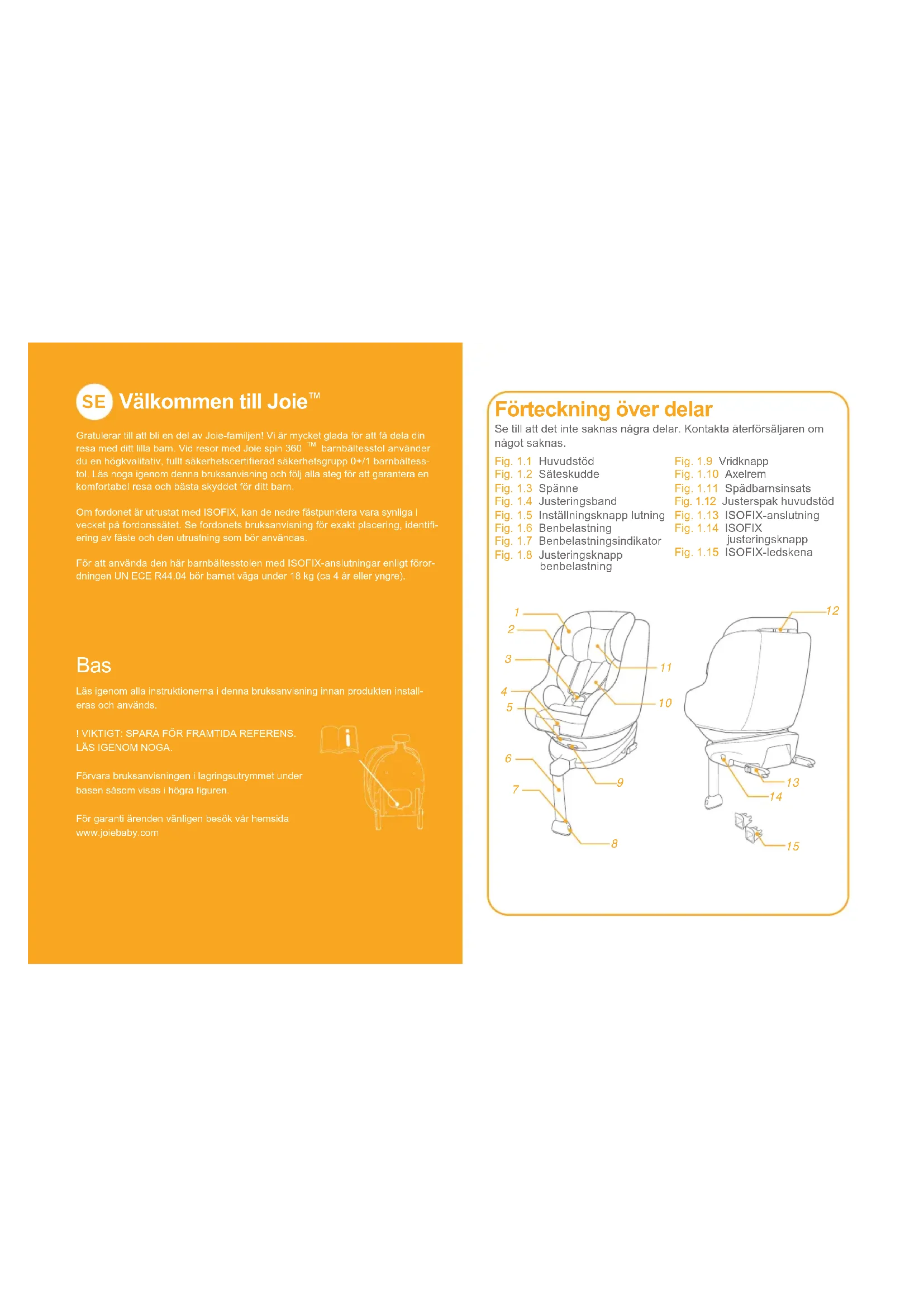 Gratulerar till att bli en del av Joie-familjen! Vi är mycket glada för att få dela din resa med ditt lilla barn. Vid resor med Joie spin 360 barnbältesstol använder du en högkvalitativ, fullt säkerhetscertifierad säkerhetsgrupp 0+/1 barnbältess-tol. Läs noga igenom denna bruksanvisning och följ alla steg för att garantera en komfortabel resa och bästa skyddet för ditt barn.Om fordonet är utrustat med ISOFIX, kan de nedre fästpunktera vara synliga i vecket på fordonssätet. Se fordonets bruksanvisning för exakt placering, identifi-ering av fäste och den utrustning som bör användas.För att använda den här barnbältesstolen med ISOFIX-anslutningar enligt föror-dningen UN ECE R44.04 bör barnet väga under 18 kg (ca 4 år eller yngre). Bas Läs igenom alla instruktionerna i denna bruksanvisning innan produkten install-eras och används.! VIKTIGT: SPARA FÖR FRAMTIDA REFERENS. LÄS IGENOM NOGA.Förvara bruksanvisningen i lagringsutrymmet under basen såsom visas i högra figuren. För garanti ärenden vänligen besök vår hemsida www.joiebaby.com Förteckning över delar Fig. 1.1 HuvudstödFig. 1.2 SäteskuddeFig. 1.3 SpänneFig. 1.4 JusteringsbandFig. 1.5 Inställningsknapp lutningFig. 1.6 BenbelastningFig. 1.7 BenbelastningsindikatorFig. 1.8 Justeringsknapp benbelastningFig. 1.9 VridknappFig. 1.10 AxelremFig. 1.11 SpädbarnsinsatsFig. 1.12 Justerspak huvudstödFig. 1.13 ISOFIX-anslutningFig. 1.14 ISOFIX justeringsknappFig. 1.15 ISOFIX-ledskenaSe till att det inte saknas några delar. Kontakta återförsäljaren om något saknas.