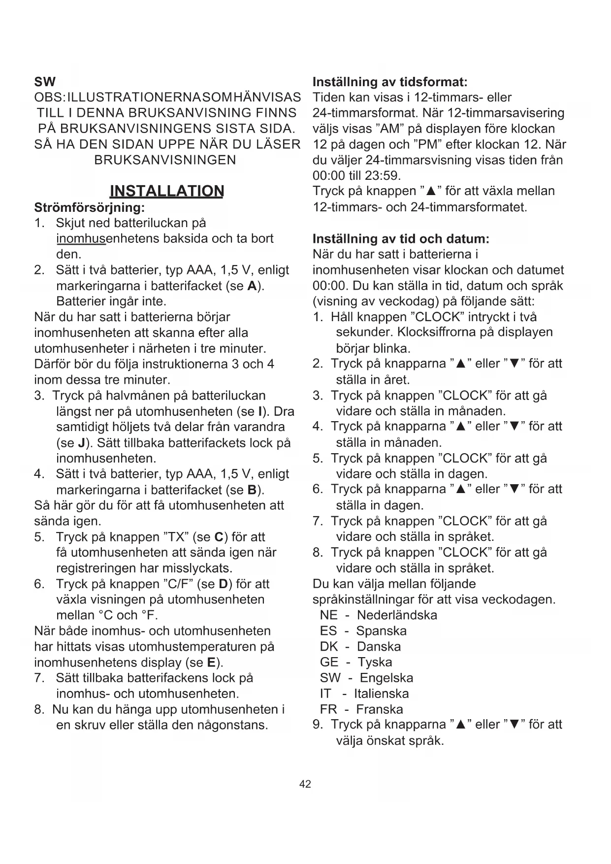 en skruv eller ställa den någonstans. Inställning av tidsformat: Tiden kan visas i 12-timmars- eller 24-timmarsformat. När 12-timmarsavisering väljs visas ”AM” på displayen före klockan 12 på dagen och ”PM” efter klockan 12. När du väljer 24-timmarsvisning visas tiden från 00:00 till 23:59. Tryck på knappen ”▲” för att växla mellan 12-timmars- och 24-timmarsformatet. Inställning av tid och datum: När du har satt i batterierna i inomhusenheten visar klockan och datumet 00:00. Du kan ställa in tid, datum och språk (visning av veckodag) på följande sätt: