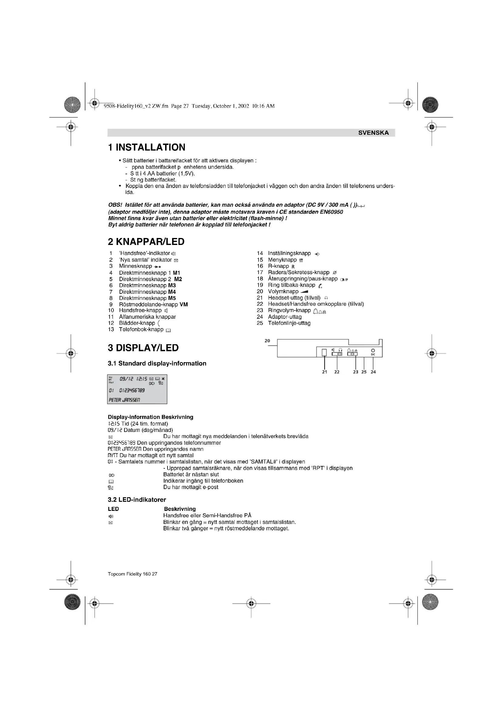 - Koppla den ena änden av telefonsladden till telefonjacket i väggen och den andra änden till telefonens unders- ida. OBS! Istället för att använda batterier, kan man också använda en adaptor (DC 9V / 300 mA ( )) (adaptor medföljer inte), denna adaptor måste motsvara kraven i CE standarden EN60950 Minnet finns kvar även utan batterier eller elektricitet (flash-minne) ! Byt aldrig batterier när telefonen är kopplad till telefonjacket ! 2 KNAPPAR/LED 3 DISPLAY/LED