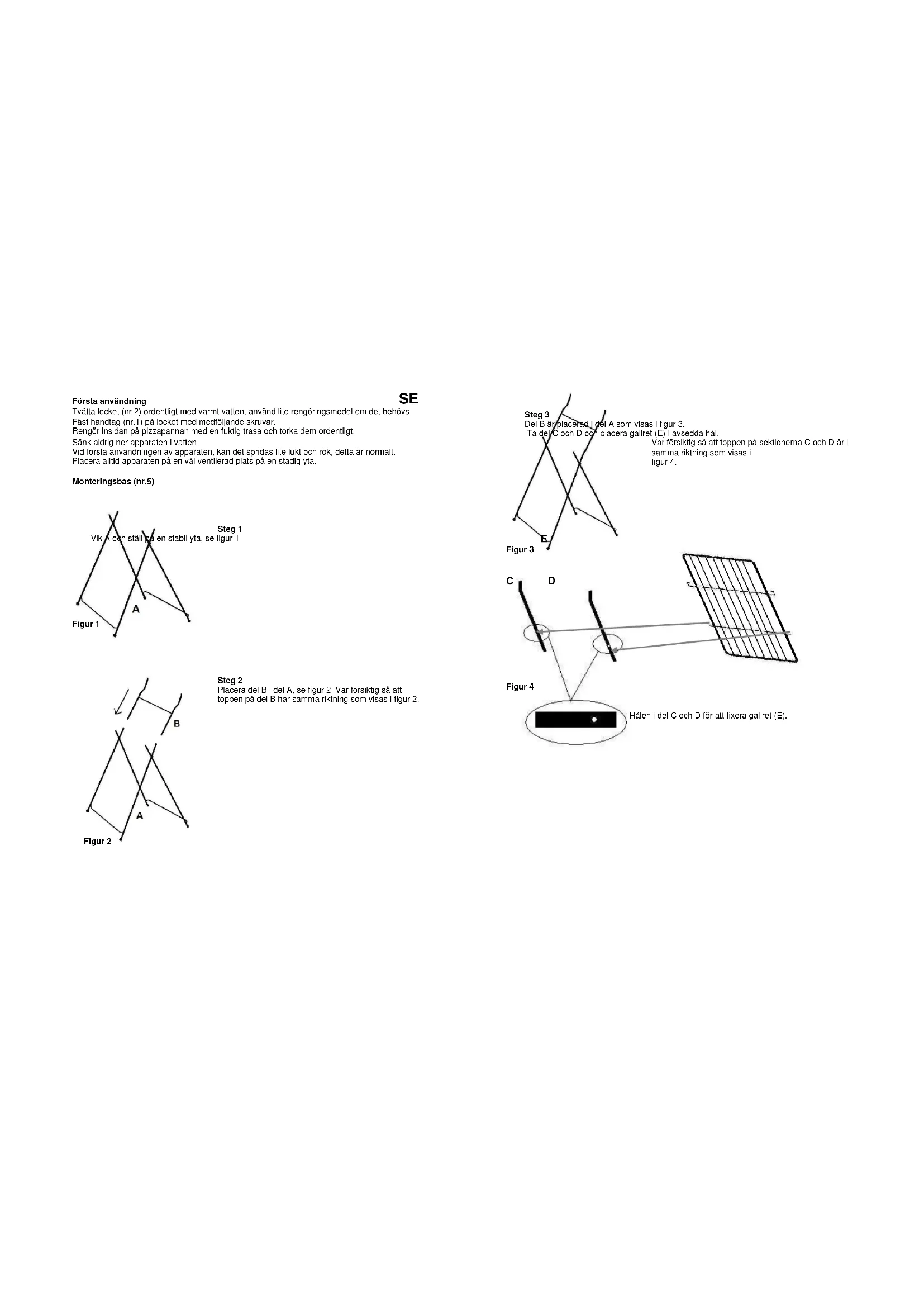 Tvätta locket (nr.2) ordentligt med varmt vatten, använd lite rengöringsmedel om det behövs. Fäst handtag (nr.1) på locket med medföljande skruvar. Rengör insidan på pizzapannan med en fuktig trasa och torka dem ordentligt. Sänk aldrig ner apparaten i vatten! Vid första användningen av apparaten, kan det spridas lite lukt och rök, detta är normalt. Placera alltid apparaten på en väl ventilerad plats på en stadig yta. Monteringsbas (nr.5)