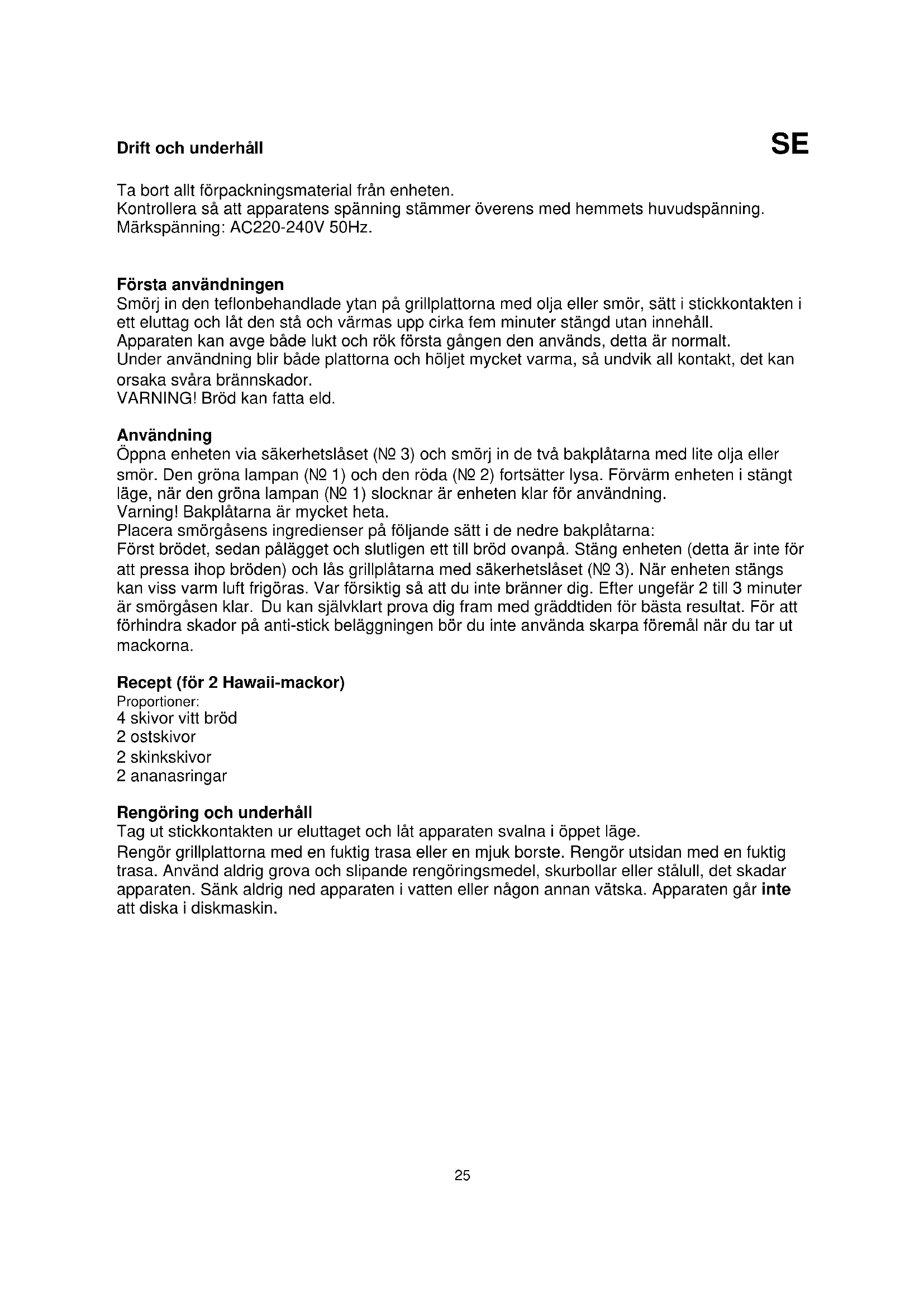 Första användningen Smörj in den teflonbehandlade ytan på grillplattorna med olja eller smör, sätt i stickkontakten i ett eluttag och låt den stå och värmas upp cirka fem minuter stängd utan innehåll. Apparaten kan avge både lukt och rök första gången den används, detta är normalt. Under användning blir både plattorna och höljet mycket varma, så undvik all kontakt, det kan orsaka svåra brännskador. VARNING! Bröd kan fatta eld. Användning Öppna enheten via säkerhetslåset (Nr. 3) och smörj in de två bakplåtarna med lite olja eller smör. Den gröna lampan (Nr. 1) och den röda (Nr. 2) fortsätter lysa. Förvärm enheten i stängt läge, när den gröna lampan (Nr. 1) slocknar är enheten klar för användning. Varning! Bakplåtarna är mycket heta. Placera smörgåsens ingredienser på följande sätt i de nedre bakplåtarna: Först brödet, sedan pålägget och slutligen ett till bröd ovanpå. Stäng enheten (detta är inte för att pressa ihop bröden) och lås grillplåtarna med säkerhetslåset (Nr. 3). När enheten stängs kan viss varm luft frigöras. Var försiktig så att du inte bränner dig. Efter ungefär 2 till 3 minuter är smörgåsen klar. Du kan självklart prova dig fram med gräddtiden för bästa resultat. För att förhindra skador på anti-stick beläggningen bör du inte använda skarpa föremål när du tar ut mackorna. Recept (för 2 Hawaii-mackor) Proportioner: 4 skivor vitt bröd 2 ostskivor 2 skinkskivor 2 ananasringar Rengöring och underhåll Tag ut stickkontakten ur eluttaget och låt apparaten svalna i öppet läge. Rengör grillplattorna med en fuktig trasa eller en mjuk borste. Rengör utsidan med en fuktig trasa. Använd aldrig grova och slipande rengöringsmedel, skurbollar eller stålull, det skadar apparaten. Sänk aldrig ned apparaten i vatten eller någon annan vätska. Apparaten går inte att diska i diskmaskin.26