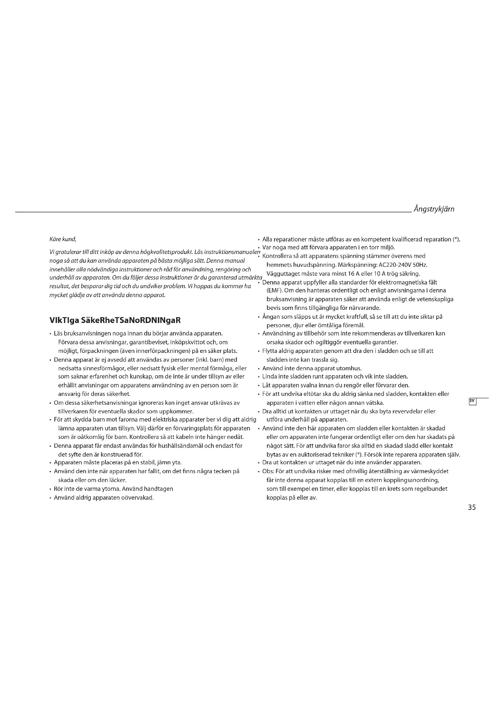 - Denna apparat uppfyller alla standarder för elektromagnetiska fält (EMF). Om den hanteras ordentligt och enligt anvisningarna i denna bruksanvisning är apparaten säker att använda enligt de vetenskapliga bevis som nns tillgängliga för närvarande.