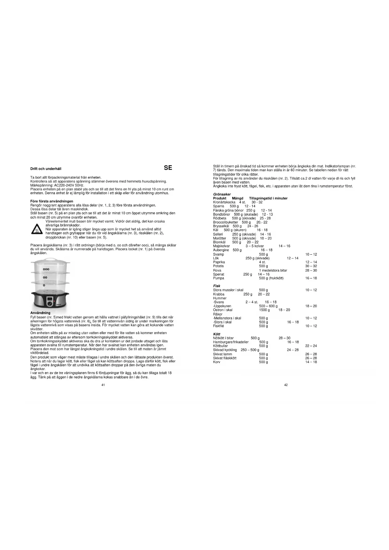 tillagningstider för olika rätter. För tillagning av ris använder du risskålen (nr. 2). Tillsätt ca.2 dl vatten för varje dl ris och fyll även basen med vatten. Ångkoka inte fryst kött, fågel, fisk, etc. i apparaten utan låt dem tina i rumstemperatur först. Grönsaker Produkt Mängd Tillagningstid i minuter Kronärtskocka 4 st. 30 - 32 Sparris 500 g 12 - 14 Färska gröna bönor 250 g 12 - 14 Bondbönor 500 g (skalade) 12 - 13 Rödbeta 500 g (skivade) 25 - 28 Broccolibuketter 500 g 20.- 22 Brysselkål 500 g 24 - 26 Kål 500 g (skuren) 16 - 18 Selleri 250 g (skivade) 14 - 16 Morötter 500 g (skivade) 18 – 20 Blomkål 500 g 20 – 22 Majskolvar 3 – 5 kolvar 14 – 16 Aubergine 500 g 16 – 18 Svamp 500 g 10 – 12 Lök 250 g (skivade) 12 – 14 Paprika 4 st. 12 – 14 Potatis 500 g 30 – 32 Rova 1 medelstora bitar 28 – 30 Spenat 250 g 14 – 16 Pumpa 500 g (fruktkött) 16 – 18 Fisk Stora musslor i skal 500 g 10 – 12 Krabba 250 g 20 – 22 Hummer -Svans 2 – 4 st. 16 – 18 -Uppskuren 500 – 600 g 18 – 20 Ostron i skal 1500 g 18 – 20 Räkor -Mellanstora i skal 500 g 10 – 12 -Stora i skal 500 g 16 – 18 Fiskfilé 500 g 10 – 12 Kött Nötkött i bitar 500 g 28 – 30 Hamburgare/frikadeller 500 g 16 – 18 Köttbullar 500 g 22 – 24 Skivad kyckling 250 – 500 g 24 – 28 Skivat lamm 500 g 26 – 28 Skivat fläskkött 500 g 26 – 28 Korv 500 g 14 – 1843 Ägg Löskokta 1 – 18 st. 15 – 20 Hårdkokta 1 – 18 st. 19 – 25