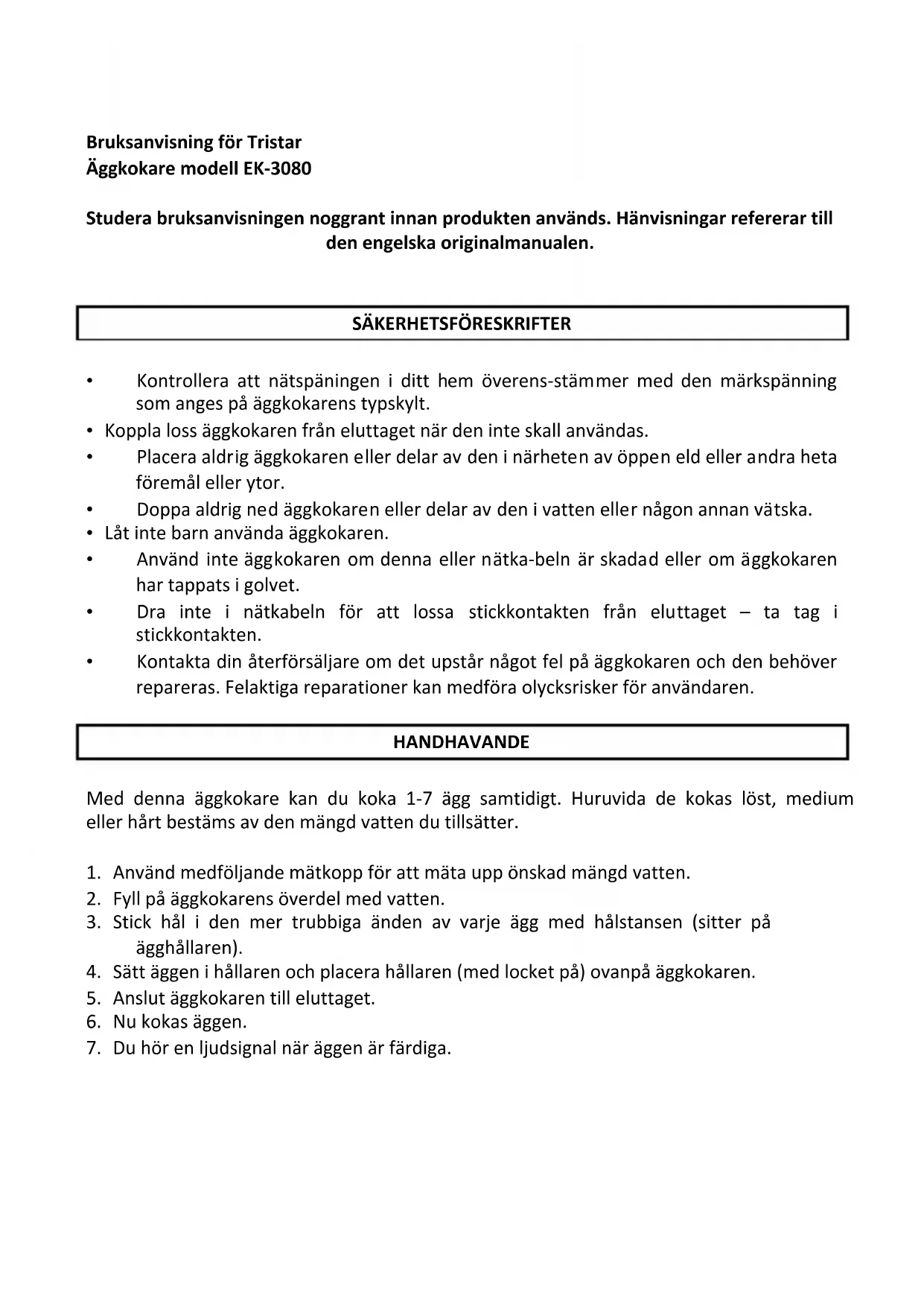 EK3080 - Äggkokare TRISTAR - Gratis bruksanvisning och manual
