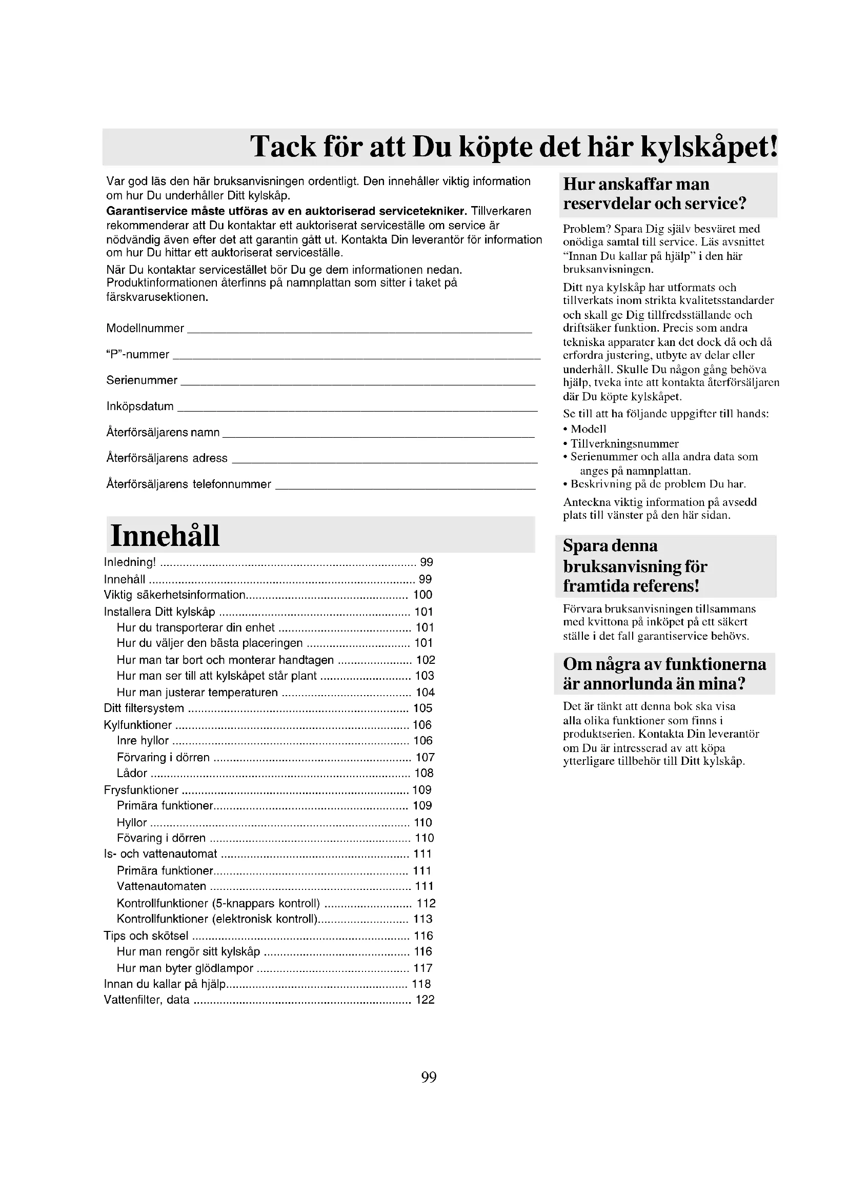 –99 Var god läs den här bruksanvisningen ordentligt. Den innehåller viktig information om hur Du underhåller Ditt kylskåp. Garantiservice måste utföras av en auktoriserad servicetekniker. Tillverkaren rekommenderar att Du kontaktar ett auktoriserat serviceställe om service är nödvändig även efter det att garantin gått ut. Kontakta Din leverantör för information om hur Du hittar ett auktoriserat serviceställe. När Du kontaktar servicestället bör Du ge dem informationen nedan. Produktinformationen återfinns på namnplattan som sitter i taket på färskvarusektionen. Modellnummer _____________________________________________________ “P”-nummer ________________________________________________________ Serienummer ______________________________________________________ Inköpsdatum _______________________________________________________ Återförsäljarens namn ________________________________________________ Återförsäljarens adress _______________________________________________ Återförsäljarens telefonnummer ________________________________________ Tack för att Du köpte det här kylskåpet! Innehåll Hur anskaffar man reservdelar och service? Problem? Spara Dig själv besväret med onödiga samtal till service. Läs avsnittet “Innan Du kallar på hjälp” i den här bruksanvisningen. Ditt nya kylskåp har utformats och tillverkats inom strikta kvalitetsstandarder och skall ge Dig tillfredsställande och driftsäker funktion. Precis som andra tekniska apparater kan det dock då och då erfordra justering, utbyte av delar eller underhåll. Skulle Du någon gång behöva hjälp, tveka inte att kontakta återförsäljaren där Du köpte kylskåpet. Se till att ha följande uppgifter till hands: