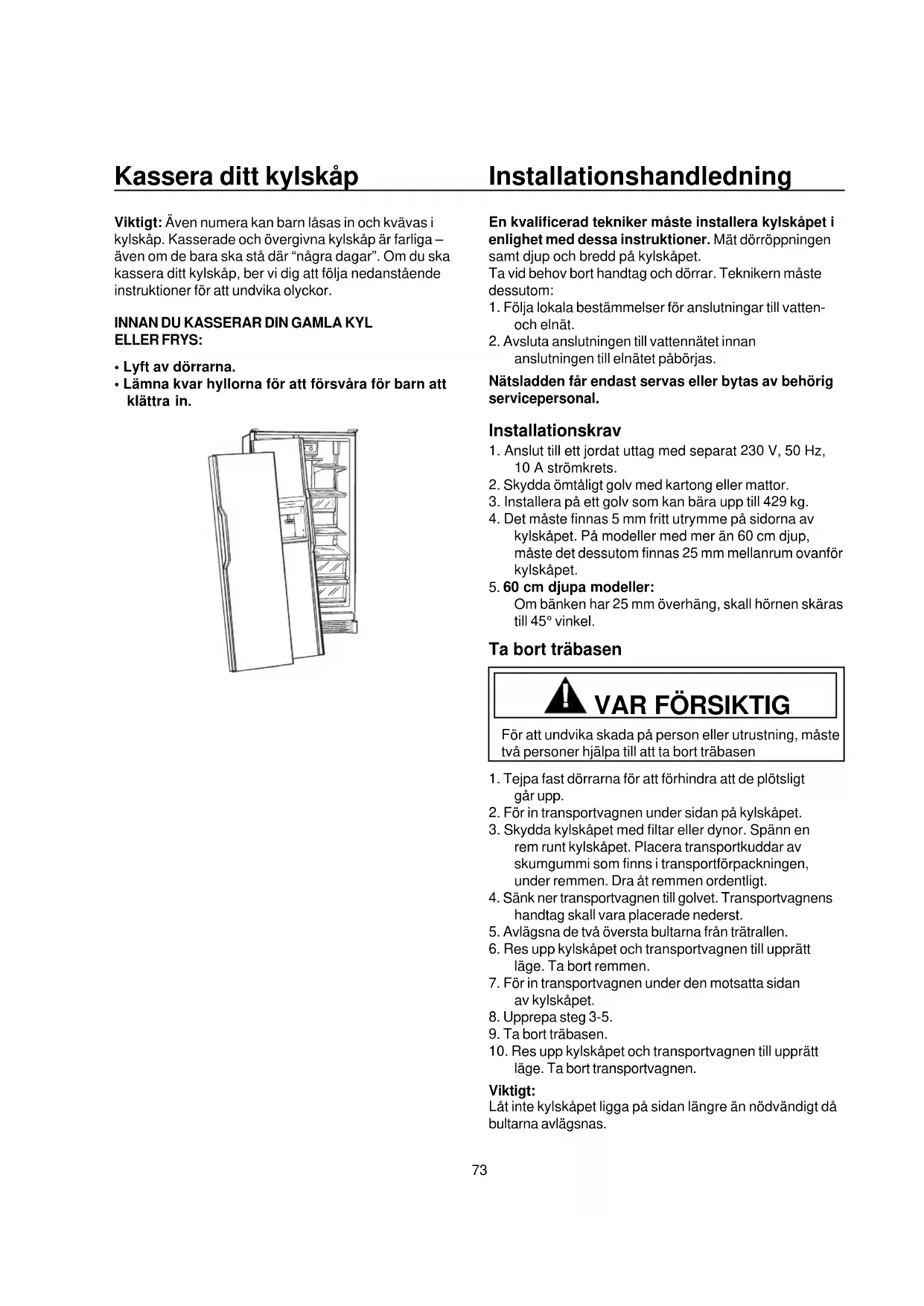 - Lämna kvar hyllorna för att försvåra för barn att klättra in. Installationshandledning En kvalificerad tekniker måste installera kylskåpet i enlighet med dessa instruktioner. Mät dörröppningen samt djup och bredd på kylskåpet. Ta vid behov bort handtag och dörrar. Teknikern måste dessutom: