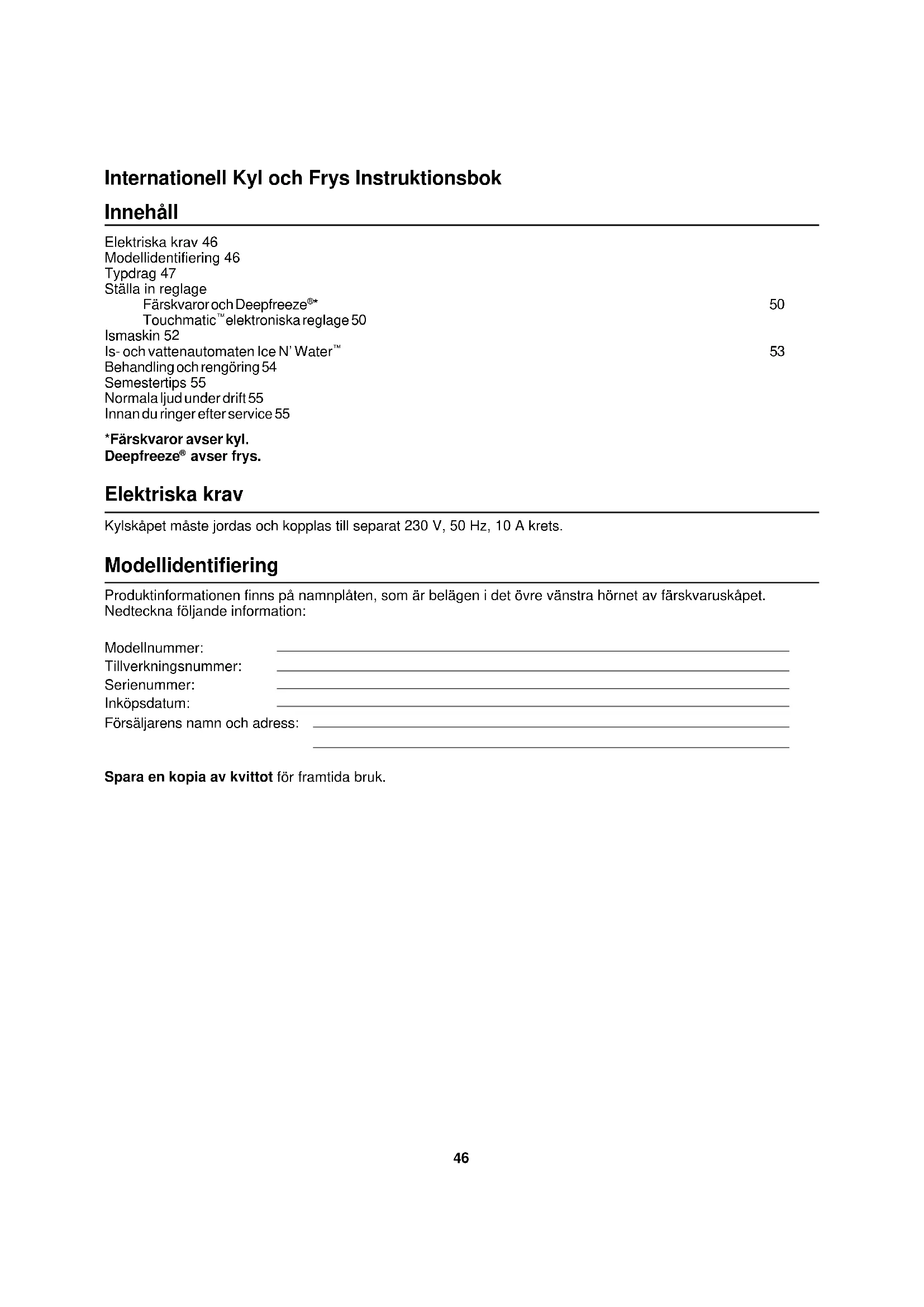 avser frys. Elektriska krav Kylskåpet måste jordas och kopplas till separat 230 V, 50 Hz, 10 A krets. Modellidentifiering Produktinformationen finns på namnplåten, som är belägen i det övre vänstra hörnet av färskvaruskåpet. Nedteckna följande information: Modellnummer: Tillverkningsnummer: Serienummer: Inköpsdatum: Försäljarens namn och adress: Spara en kopia av kvittot för framtida bruk.47 Typdrag Färskvaruskåp (Kyl)