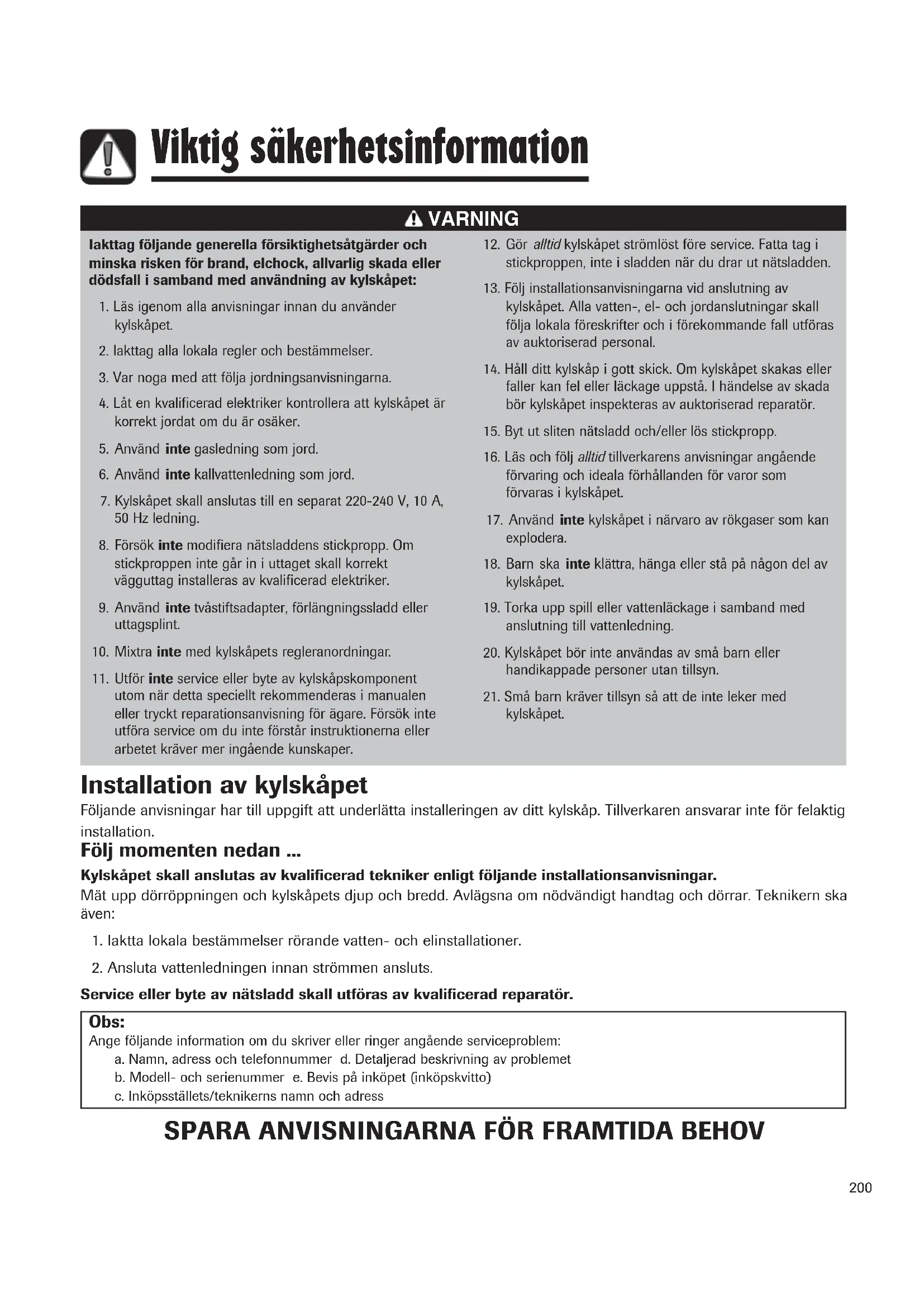 - Kyl/frysskåp Manual Viktig säkerhetsinformation p. 199