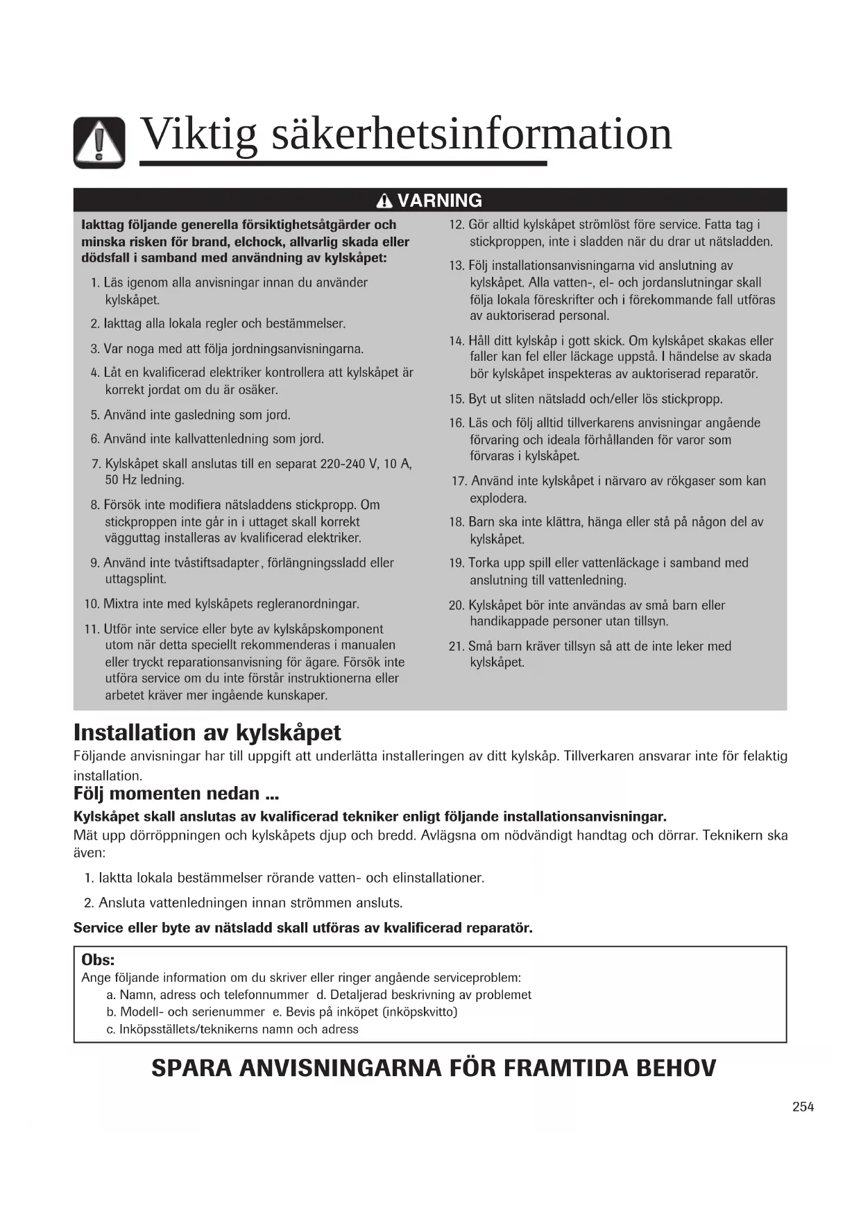 - Folj installationsanvisingarna vid anslutning av kylskapet. Alla vatten-, el- och jordansluttingar skull folja lokala foreskrifter och i forekommande fall utforas av auktoriserad personal.