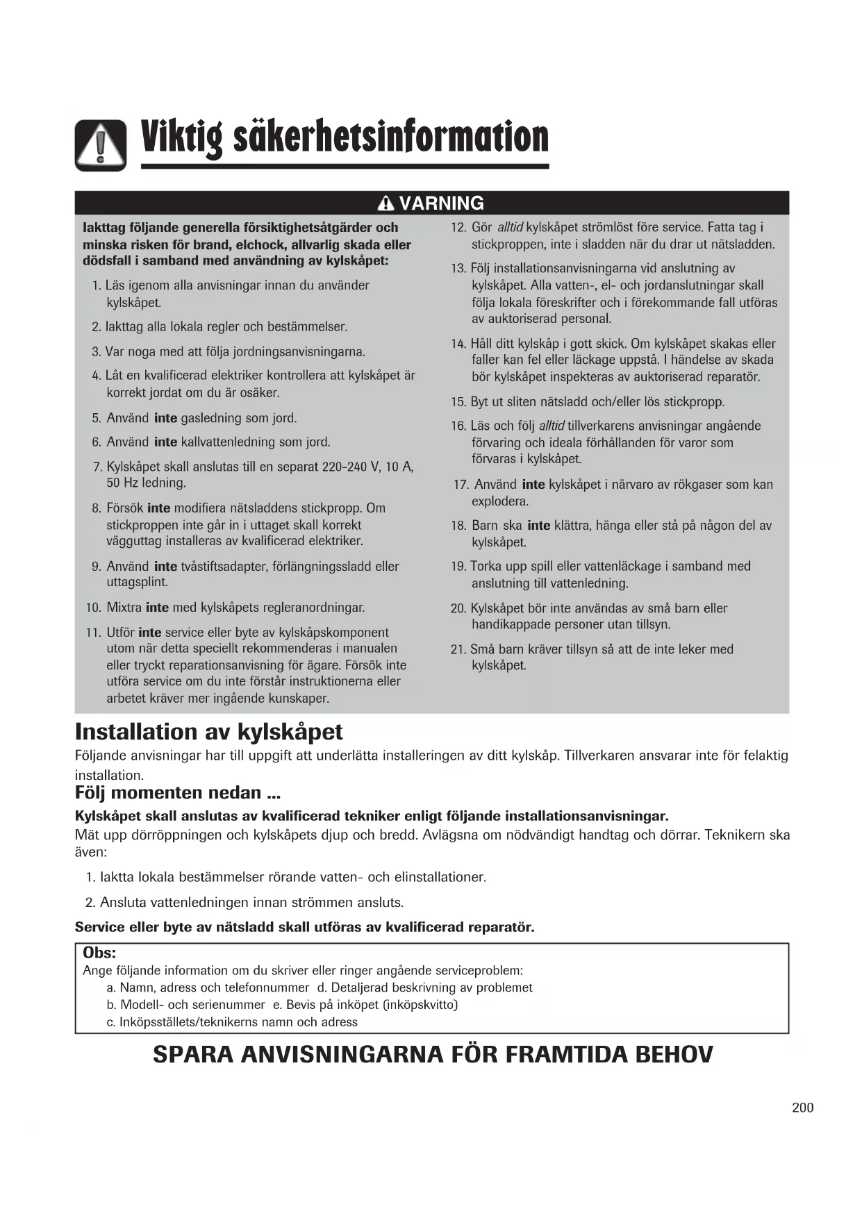 - Kyl/frysskåp Manual Viktig säkerhetsinformation p. 199