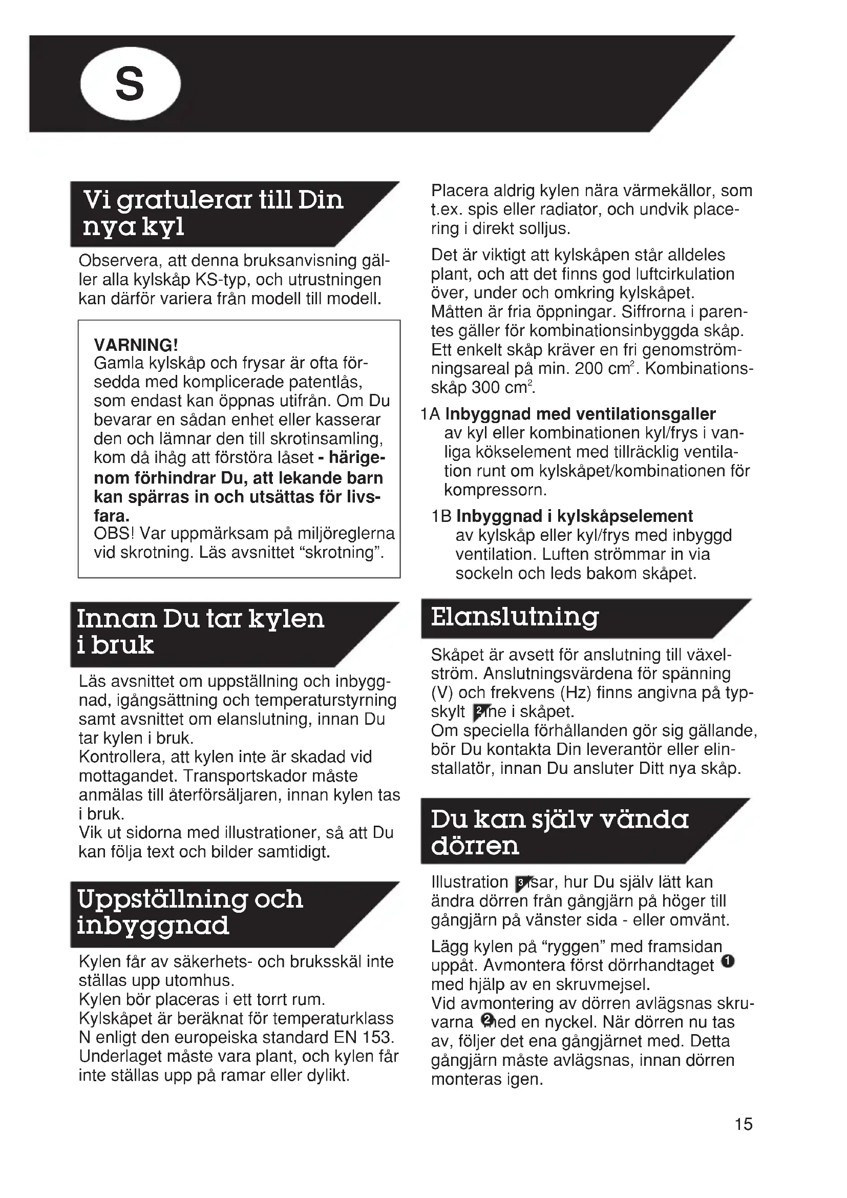 1A Inbyggnad med ventilationsgaller av kyl eller kombinationen kyl/frys i van- liga kökselement med tillräcklig ventila- tion runt om kylskåpet/kombinationen för kompressorn. 1B Inbyggnad i kylskåpselement av kylskåp eller kyl/frys med inbyggd ventilation. Luften strömmar in via sockeln och leds bakom skåpet. Skåpet är avsett för anslutning till växel- ström. Anslutningsvärdena för spänning (V) och frekvens (Hz) finns angivna på typ- skylt inne i skåpet. Om speciella förhållanden gör sig gällande, bör Du kontakta Din leverantör eller elin- stallatör, innan Du ansluter Ditt nya skåp. Illustration visar, hur Du själv lätt kan ändra dörren från gångjärn på höger till gångjärn på vänster sida - eller omvänt. Lägg kylen på “ryggen” med framsidan uppåt. Avmontera först dörrhandtaget med hjälp av en skruvmejsel. Vid avmontering av dörren avlägsnas skru- varna med en nyckel. När dörren nu tas av, följer det ena gångjärnet med. Detta gångjärn måste avlägsnas, innan dörren monteras igen.