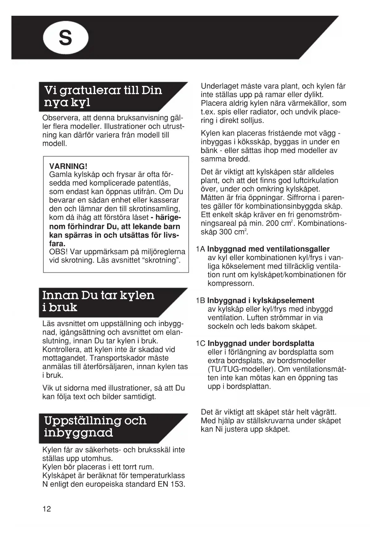 1A Inbyggnad med ventilationsgaller av kyl eller kombinationen kyl/frys i van- liga kökselement med tillräcklig ventila- tion runt om kylskåpet/kombinationen för kompressorn. 1B Inbyggnad i kylskåpselement av kylskåp eller kyl/frys med inbyggd ventilation. Luften strömmar in via sockeln och leds bakom skåpet. 1C Inbyggnad under bordsplatta eller i förlängning av bordsplatta som extra bordsplats, av bordsmodeller (TU/TUG-modeller). Om ventilationsmåt- ten inte kan mötas kan en öppning tas upp i bordsplattan. Det är viktigt att skåpet står helt vågrätt. Med hjälp av ställskruvarna under skåpet kan Ni justera upp skåpet. Observera, att denna bruksanvisning gäl- ler flera modeller. Illustrationer och utrust- ning kan därför variera från modell till modell. VARNING! Gamla kylskåp och frysar är ofta för- sedda med komplicerade patentlås, som endast kan öppnas utifrån. Om Du bevarar en sådan enhet eller kasserar den och lämnar den till skrotinsamling, kom då ihåg att förstöra låset - härige- nom förhindrar Du, att lekande barn kan spärras in och utsättas för livs- fara. OBS! Var uppmärksam på miljöreglerna vid skrotning. Läs avsnittet “skrotning”. Läs avsnittet om uppställning och inbygg- nad, igångsättning och avsnittet om elan- slutning, innan Du tar kylen i bruk. Kontrollera, att kylen inte är skadad vid mottagandet. Transportskador måste anmälas till återförsäljaren, innan kylen tas i bruk. Vik ut sidorna med illustrationer, så att Du kan följa text och bilder samtidigt. Kylen får av säkerhets- och bruksskäl inte ställas upp utomhus. Kylen bör placeras i ett torrt rum. Kylskåpet är beräknat för temperaturklass N enligt den europeiska standard EN 153. Vi gratulerar till Din nya kyl Uppställning och inbyggnad Innan Du tar kylen i brukS