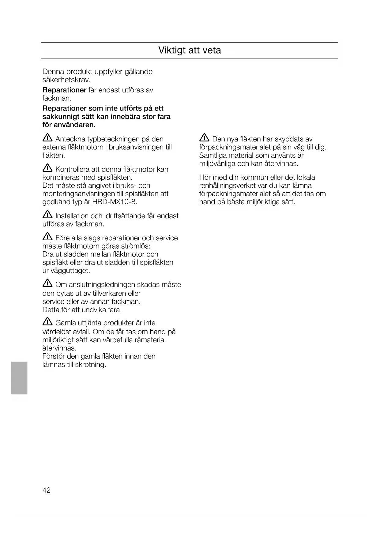την ηλεκτρική σύνδεση απ τη φτερωτή προς τον απορροφητήρα. Το πρσθετο κάλυµµα στο φις πρέπει για λγους ασφαλείας να είναι πάντοτε τοποθετηµένο και κλειστ.42 Viktigt att veta Denna produkt uppfyller gällande säkerhetskrav. Reparationer får endast utföras av fackman. Reparationer som inte utförts på ett sakkunnigt sätt kan innebära stor fara för användaren. Anteckna typbeteckningen på den externa fläktmotorn i bruksanvisningen till fläkten. Kontrollera att denna fläktmotor kan kombineras med spisfläkten. Det måste stå angivet i bruks- och monteringsanvisningen till spisfläkten att godkänd typ är HBD-MX10-8. Installation och idriftsättande får endast utföras av fackman. Före alla slags reparationer och service måste fläktmotorn göras strömlös: Dra ut sladden mellan fläktmotor och spisfläkt eller dra ut sladden till spisfläkten ur vägguttaget. Om anslutningsledningen skadas måste den bytas ut av tillverkaren eller service eller av annan fackman. Detta för att undvika fara. Gamla uttjänta produkter är inte värdelöst avfall. Om de får tas om hand på miljöriktigt sätt kan värdefulla råmaterial återvinnas. Förstör den gamla fläkten innan den lämnas till skrotning. Denna produkt uppfyller gällande säkerhetskrav. Reparationer får endast utföras av fackman. Reparationer som inte utförts på ett sakkunnigt sätt kan innebära stor fara för användaren. Den nya fläkten har skyddats av förpackningsmaterialet på sin väg till dig. Samtliga material som använts är miljövänliga och kan återvinnas. Hör med din kommun eller det lokala renhållningsverket var du kan lämna förpackningsmaterialet så att det tas om hand på bästa miljöriktiga sätt.43 Före monteringen