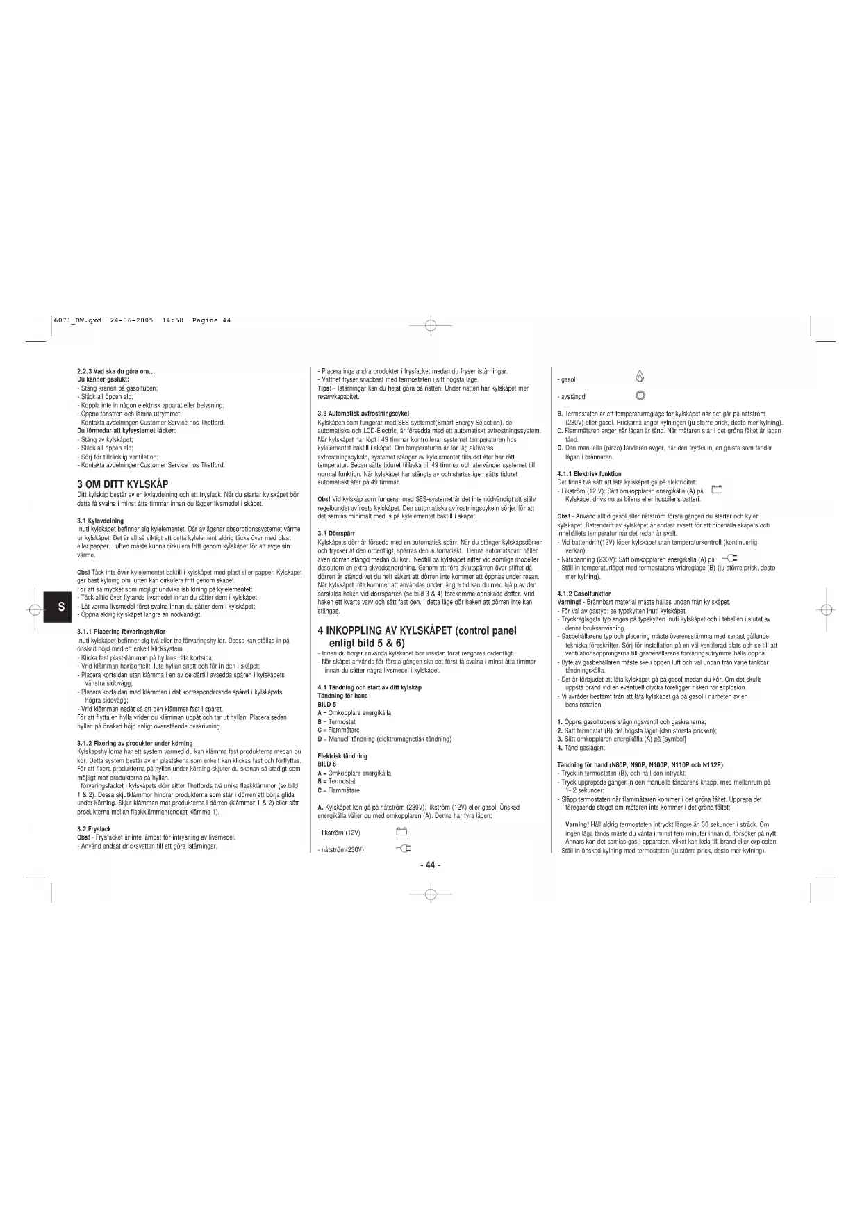 Instruktionsbok 6071_BW.qxd 24-06-2005 14:58 Pagina 432.2.3 Vad ska du göra om... Du känner gaslukt: - Stäng kranen på gasoltuben; - Släck all öppen eld; - Koppla inte in någon elektrisk apparat eller belysning; - Öppna fönstren och lämna utrymmet; - Kontakta avdelningen Customer Service hos Thetford. Du förmodar att kylsystemet läcker: - Stäng av kylskåpet; - Släck all öppen eld; - Sörj för tillräcklig ventilation; - Kontakta avdelningen Customer Service hos Thetford.
