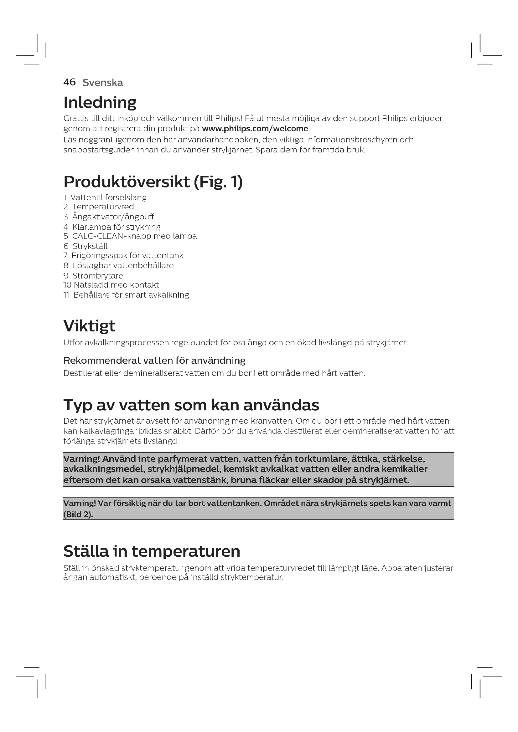 Ull, viskos, polyester och siden 3 till LINNE Bomull, linne Håll ned ångaktivatorn för att börja stryka. När du stryker med ånga får du de bästa strykresultaten genom att göra de sista dragen med strykjärnet utan att använda ånga. Automatisk avstängning Endast vissa modeller i den här serien har automatisk avstängning. - Strykjärnet slås av automatiskt när det inte har använts på 5 minuter för att spara energi. Klarlampan för strykning börjar blinka. - Slå på apparaten igen genom att trycka på/av-knappen till Av-läget och sedan trycka den till På- läget igen. Apparaten värms sedan upp igen. Rengöring och underhåll Smart avkalkningssystem Det inbyggda smarta avkalkningssystemet påminner dig om att kalka av och rengöra strykjärnet regelbundet. Systemet ser till att strykjärnets ångprestanda inte försämras och motverkar att smuts avges från stryksulan och äckar tygerna du stryker. Ånggeneratorn påminner dig regelbundet om att utföra avkalkningsprocessen. Avkalkningspåminnelse med ljud och lampa Efter en till tre månaders användning börjar avkalkningslampan blinka och apparaten piper för att ange att du behöver utföra avkalkningsprocessen (Bild 3). Tips! Du kan fortsätta torrstryka genom att inte trycka på ångaktivatorn. Därutöver nns det ytterligare en skyddsåtgärd som skyddar ånggeneratorn mot kalkavlagringar: ångfunktionen stängs av om ingen avkalkning utförs. Efter avkalkning återställs ångfunktionen. Detta sker oavsett vilken typ av vatten som används. Obs! Avkalkningsprocessen kan utföras när som helst, även innan påminnelsen via ljud och lampa har aktiverats. Utföra avkalkningsprocessen med avkalkningsbehållaren Varning! Lämna inte apparaten obevakad under avkalkningen. Varning! Du ska inte avbryta processen genom att lyfta ur strykjärnet från avkalkningsbehållaren eftersom det kommer varmt vatten och ånga från stryksulan. 1 Fyll vattentanken till hälften (Bild 4). Obs! Se till att apparaten är ansluten och påslagen under avkalkningen.48 Svenska 2 Ställ behållaren för avkalkning på strykbrädan eller någon annan jämn, stabil yta. 3 Placera strykjärnet på avkalkningsbehållaren (Bild 5). Obs! Avkalkningsbehållaren samlar upp kalkpartiklar och varmt vatten under avkalkningsprocessen. Du behöver inte vara orolig för att lämna strykjärnet på avkalkningsbehållaren under den här processen. 4 Håll avkalkningsknappen intryckt under två sekunder till dess att korta pip (Bild 6) hörs. 5 Under avkalkningsprocessen hörs korta pip och pumpljud (Bild 7). 6 När avkalkningsprocessen har slutförts slutar strykjärnet pipa och CALC CLEAN-lampan slutar blinka (Bild 8). 7 Torka av strykjärnet med en trasa och ställ tillbaka det på basstationen (Bild 9). 8 Eftersom behållaren för avkalkning blir varm vid avkalkningen bör du vänta ungefär 5 minuter innan du rör vid den. Töm avkalkningsbehållaren och ställ undan den för framtida användning (Bild 10). 9 Upprepa steg 1–7 vid behov. Glöm inte att tömma avkalkningsbehållaren innan du startar avkalkningsprocessen. Obs! Det kan rinna rent vatten från stryksulan under avkalkningsprocessen om det inte har hunnit bildas några kalkavlagringar i strykjärnet. Det är normalt. Felsökning Det här kapitlet sammanfattar de vanligaste problemen som kan uppstå med apparaten. Om du inte kan lösa problemet med hjälp av informationen nedan kan du besöka www.philips.com/support och läsa svaren på vanliga frågor eller kontakta kundtjänsten i ditt land. Problem Möjlig orsak Lösning Strykjärnet avger inte någon ånga. Du har ställt in temperaturvredet på SYNTH 1. Vrid temperaturvredet till 2 eller en högre temperatur. Ångfunktionen avaktiveras tills du har utfört avkalkningsprocessen. Du måste utföra avkalkningsprocessen om du vill återställa ångfunktionen. (Se kapitlet Rengöring och underhåll.) Du tryckte inte in ångaktivatorn tillräckligt länge när du började stryka. Tryck in och håll ned ångaktivatorn tills ånga kommer ut. Det kan ta upp till 30 sekunder innan strykjärnet börjar avge ånga. Avkalkningslampan blinkar. Det kommer ingen ånga från stryksulan och/eller apparaten piper. Du har inte utfört eller slutfört avkalkningsprocessen. Utför avkalkningsprocessen för att aktivera ångfunktionen igen (se kapitlet Rengöring och underhåll). Apparaten har stängts av. Säkerhetsavstängningsfunktionen aktiveras automatiskt när apparaten inte har använts på över 5 minuter. Starta apparaten igen genom att trycka på/av-knappen till Av-läget och sedan trycka den till På-läget igen. Strykjärnet värms då upp igen. Apparaten avger ett högt pumpljud. Vattenbehållaren är tom. Fyll på vattentanken med vatten och tryck på ångaktivatorn tills pumpljudet blir tystare och ånga kommer ut ur stryksulan.