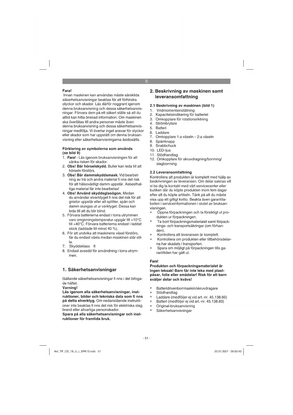 För slagborrning ska omkopplaren (12) ställas på läge „Hammare“. Slirkopplingen är frånslagen och maximalt vridmoment är tillgängligt oberoende av vridmomentsinställningen (1). Märk Maskinen måste stå stilla innan vridmomentsinställningen (1) ställs in och omkopplaren för skruvdragning/borrning/ slagborrning (12) ändras. Anl_TP_CD_18_Li_i_SPK13.indb 53Anl_TP_CD_18_Li_i_SPK13.indb 53 20.07.2021 09:50:4320.07.2021 09:50:43S