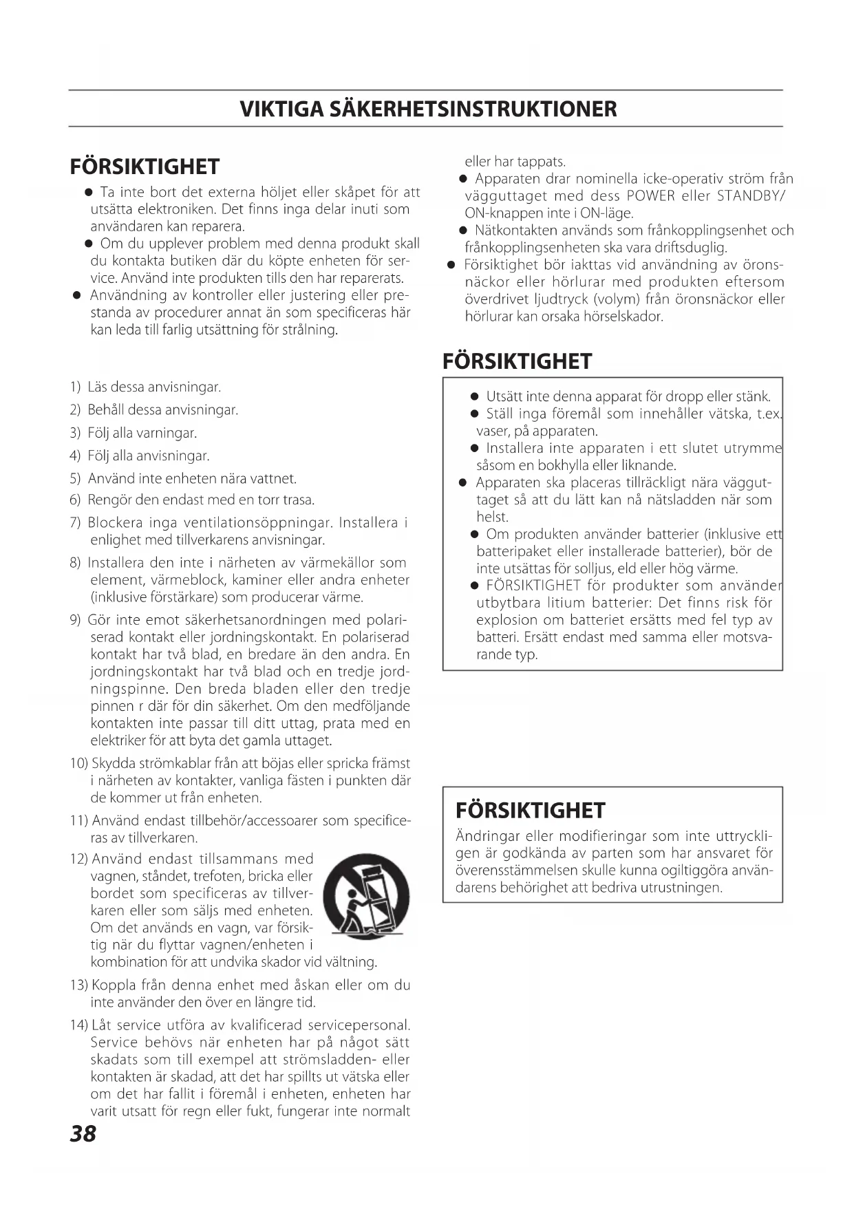 Service behövs när enheten har på något sätt skadats som till exempel att strömsladden- eller kontakten är skadad, att det har spillts ut vätska eller om det har fallit i föremål i enheten, enheten har varit utsatt för regn eller fukt, fungerar inte normalt eller har tappats. o Apparaten drar nominella icke-operativ ström från vägguttaget med dess POWER eller STANDBY/ ON-knappen inte i ON-läge. o Nätkontakten används som frånkopplingsenhet och frånkopplingsenheten ska vara driftsduglig. o Försiktighet bör iakttas vid användning av örons- näckor eller hörlurar med produkten eftersom överdrivet ljudtryck (volym) från öronsnäckor eller hörlurar kan orsaka hörselskador. FÖRSIKTIGHET o Utsätt inte denna apparat för dropp eller stänk. o Ställ inga föremål som innehåller vätska, t.ex. vaser, på apparaten. o Installera inte apparaten i ett slutet utrymme såsom en bokhylla eller liknande. o Apparaten ska placeras tillräckligt nära väggut- taget så att du lätt kan nå nätsladden när som helst. o Om produkten använder batterier (inklusive ett batteripaket eller installerade batterier), bör de inte utsättas för solljus, eld eller hög värme. o FÖRSIKTIGHET för produkter som använder utbytbara litium batterier: Det finns risk för explosion om batteriet ersätts med fel typ av batteri. Ersätt endast med samma eller motsva- rande typ. FÖRSIKTIGHET Ändringar eller modifieringar som inte uttryckli- gen är godkända av parten som har ansvaret för överensstämmelsen skulle kunna ogiltiggöra använ- darens behörighet att bedriva utrustningen.39 Modell för Europa