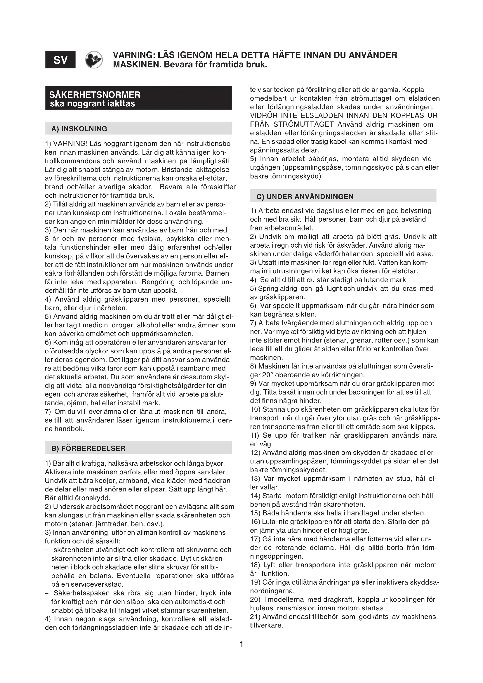 Eldriven förarledd gräsklippare BRUKSANVISNING VARNING: läs igenom hela detta häfte innan du använder maskinen.