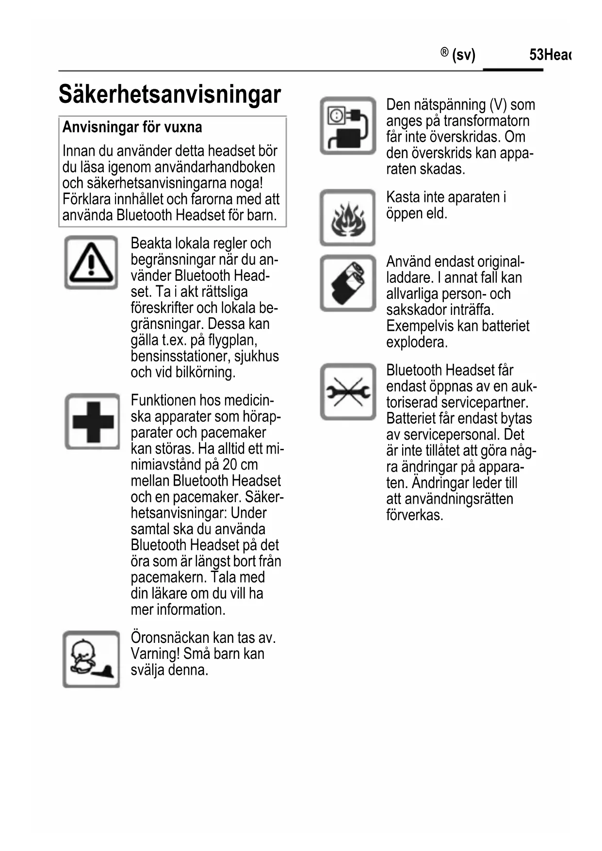 th® Säkerhetsanvisningar Anvisningar för vuxna Innan du använder detta headset bör du läsa igenom användarhandboken och säkerhetsanvisningarna noga! Förklara innhållet och farorna med att använda Bluetooth Headset för barn. Beakta lokala regler och begränsningar när du an- vänder Bluetooth Head- set. Ta i akt rättsliga föreskrifter och lokala be- gränsningar. Dessa kan gälla t.ex. på flygplan, bensinsstationer, sjukhus och vid bilkörning. Funktionen hos medicin- ska apparater som hörap- parater och pacemaker kan störas. Ha alltid ett mi- nimiavstånd på 20 cm mellan Bluetooth Headset och en pacemaker. Säker- hetsanvisningar: Under samtal ska du använda Bluetooth Headset på det öra som är längst bort från pacemakern. Tala med din läkare om du vill ha mer information. Öronsnäckan kan tas av. Varning! Små barn kan svälja denna. Den nätspänning (V) som anges på transformatorn får inte överskridas. Om den överskrids kan appa- raten skadas. Kasta inte aparaten i öppen eld. Använd endast original- laddare. I annat fall kan allvarliga person- och sakskador inträffa. Exempelvis kan batteriet explodera. Bluetooth Headset får endast öppnas av en auk- toriserad servicepartner. Batteriet får endast bytas av servicepersonal. Det är inte tillåtet att göra någ- ra ändringar på appara- ten. Ändringar leder till att användningsrätten förverkas.Headset PTT Bluetooth