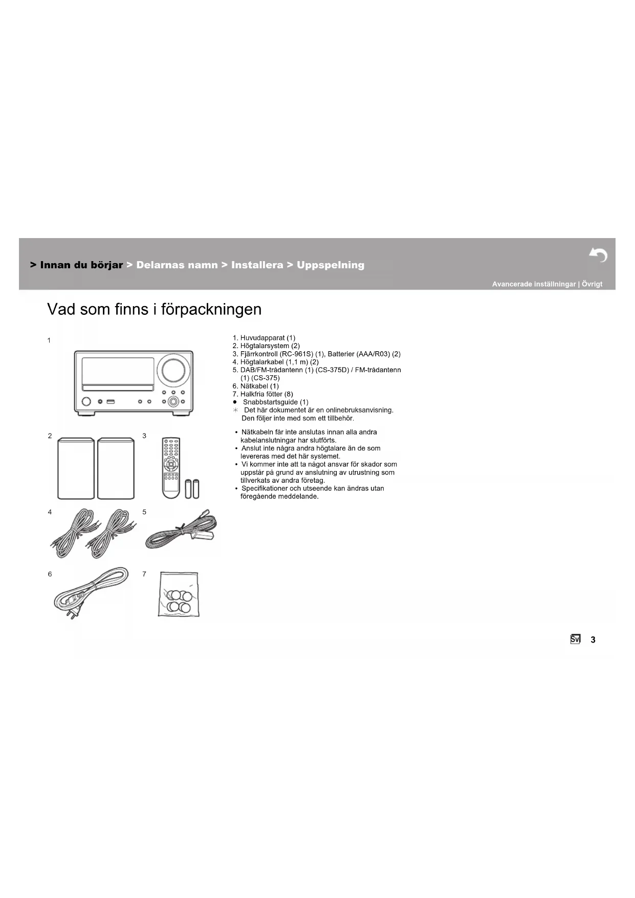 Vad som finns i förpackningen 1. Huvudapparat (1)2. Högtalarsystem (2)3. Fjärrkontroll (RC-961S) (1), Batterier (AAA/R03) (2)4. Högtalarkabel (1,1 m) (2)5. DAB/FM-trådantenn (1) (CS-375D) / FM-trådantenn (1) (CS-375)6. Nätkabel (1)7. Halkfria fötter (8)≥ Snabbstartsguide (1)¢ Det här dokumentet är en onlinebruksanvisning. Den följer inte med som ett tillbehör.0 Nätkabeln får inte anslutas innan alla andra kabelanslutningar har slutförts.0 Anslut inte några andra högtalare än de som levereras med det här systemet.0 Vi kommer inte att ta något ansvar för skador som uppstår på grund av anslutning av utrustning som tillverkats av andra företag.0 Specifikationer och utseende kan ändras utan föregående meddelande.